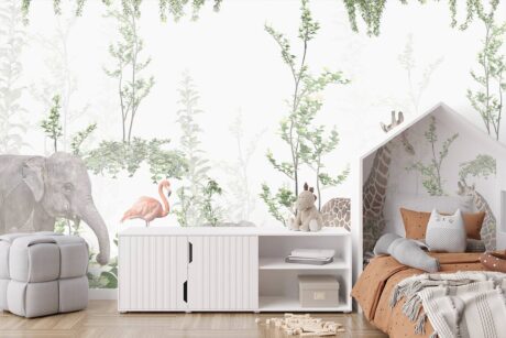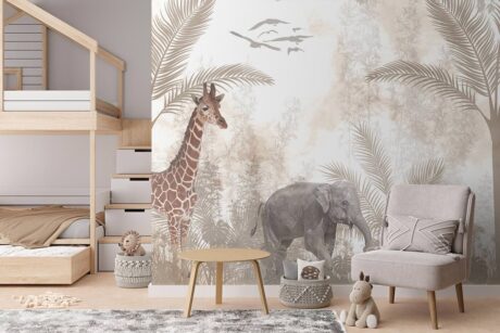 Met junglebehang haal je de spanning en magie van de wildernis in huis: adembenemende landschappen met sterke leeuwen, sierlijke giraffen, ondeugende apen en kleurrijke papegaaien die de muren van de kinderkamer sieren. Dit type behang creëert een fantasierijke omgeving waarin je kind kan spelen, leren en groeien. Het behang stimuleert een gevoel van avontuur en ontdekking, wat de nieuwsgierigheid van kinderen stimuleert. Het is het perfecte startpunt voor verhalen, spelletjes en educatieve gesprekken over de natuur en wilde dieren. Zie je jouw kleintje al door de kamer rennen alsof hij of zij een heuse verkenner is, op zoek naar de big five?