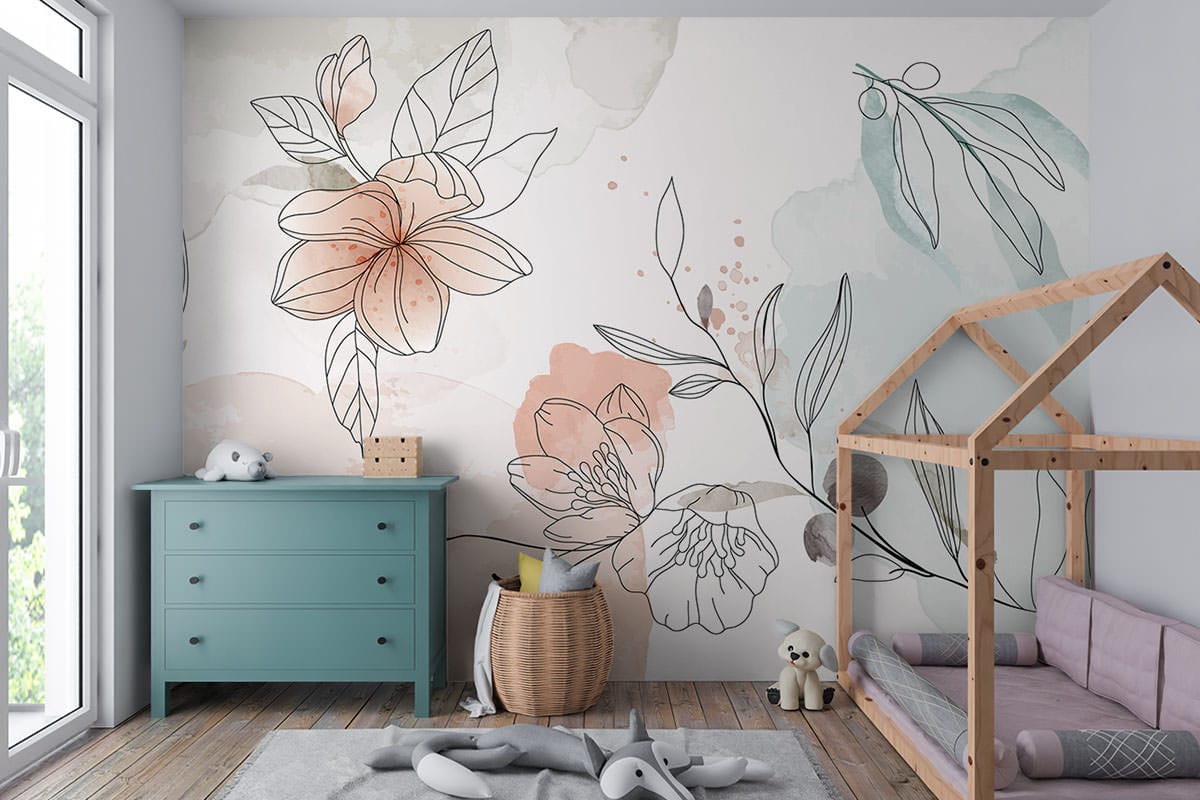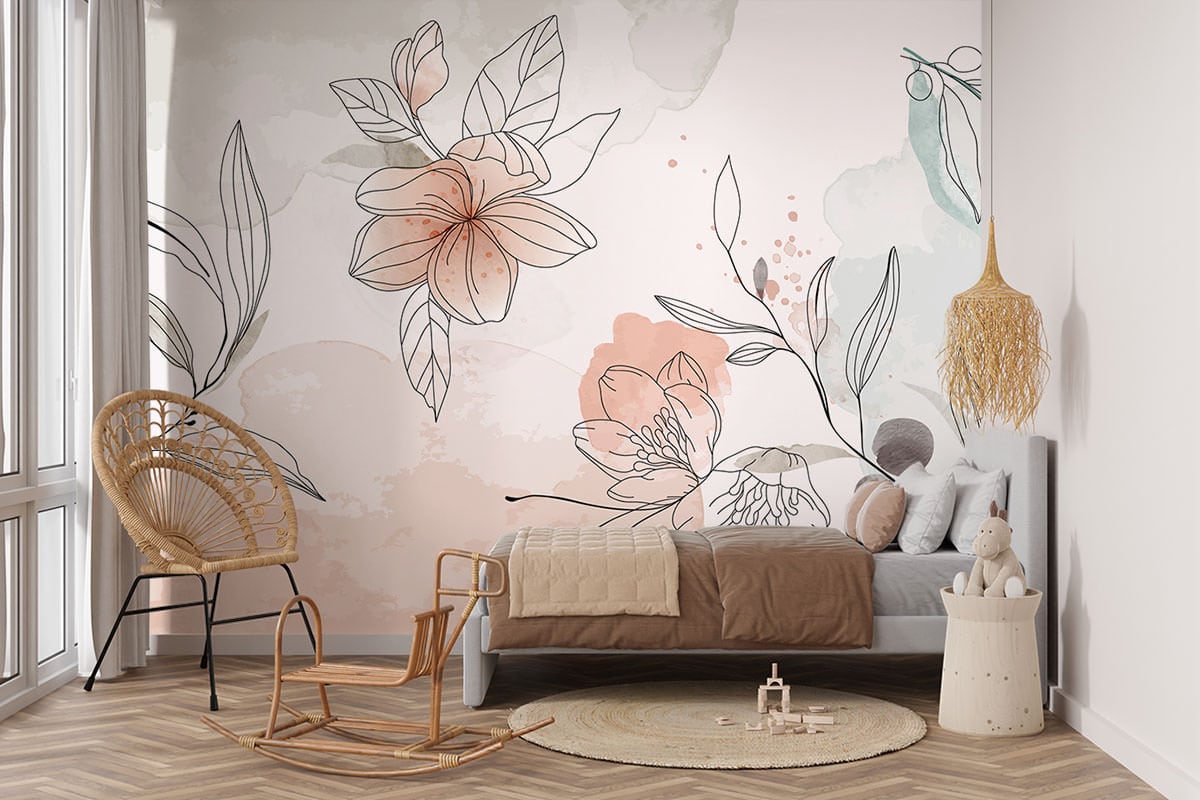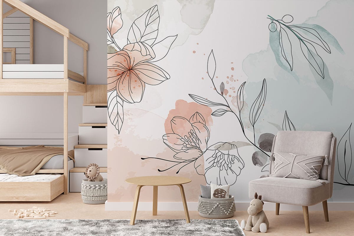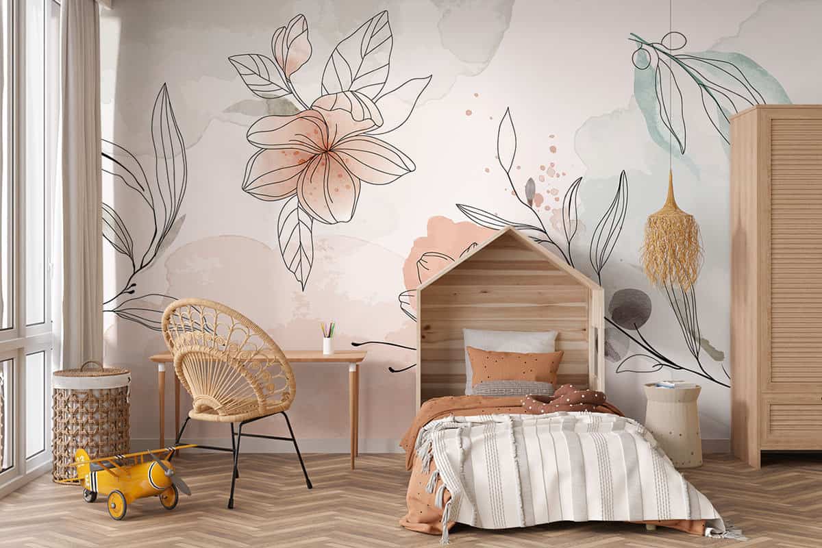 Met dit bloemige lijntekening behang creëer je een rustgevende en esthetische kinderkamer. Mooi voor jouw kindje en jezelf!