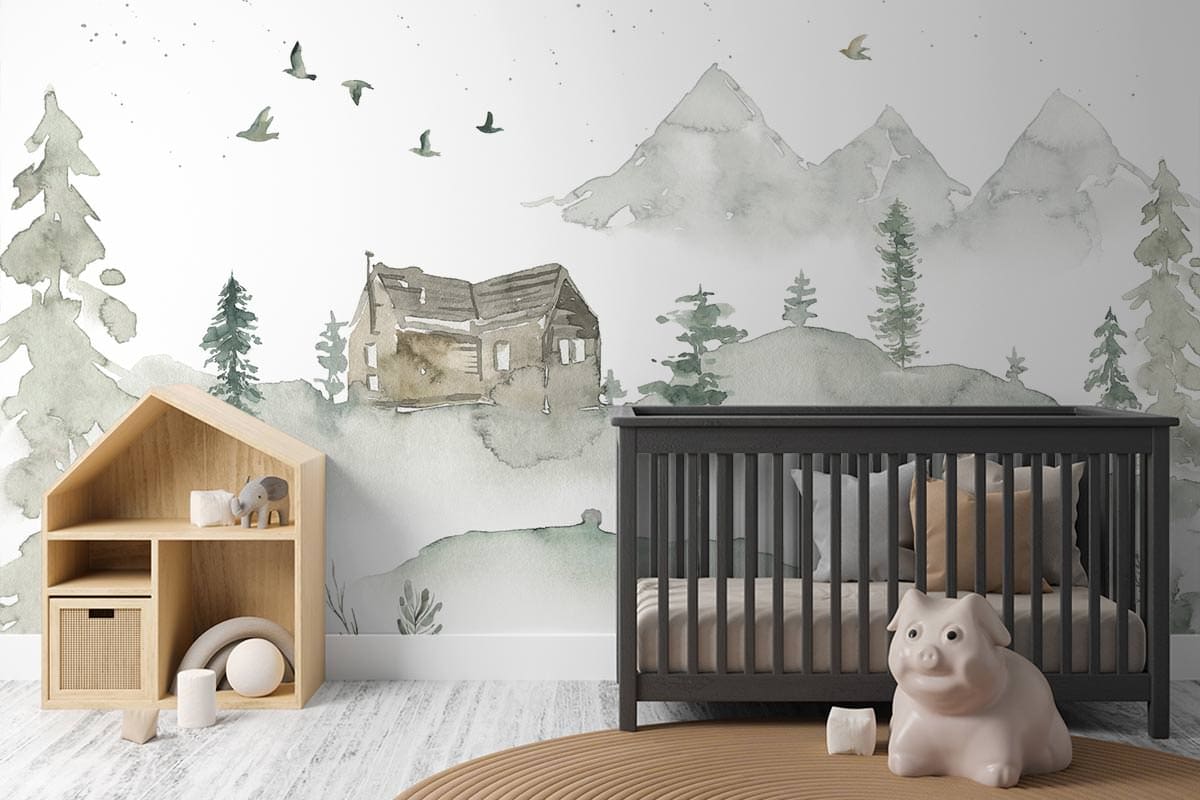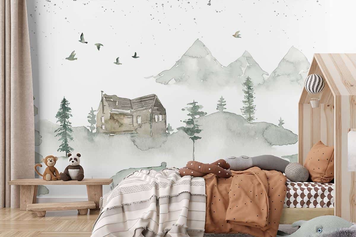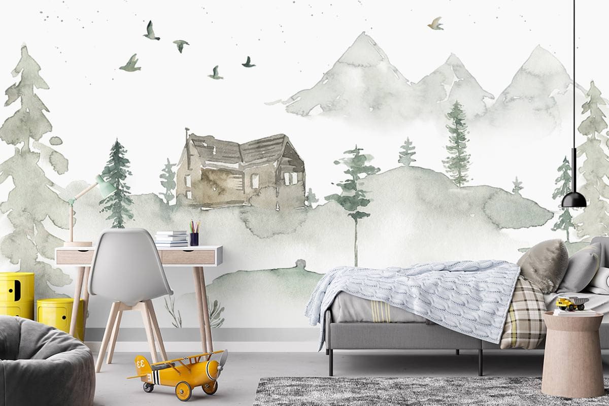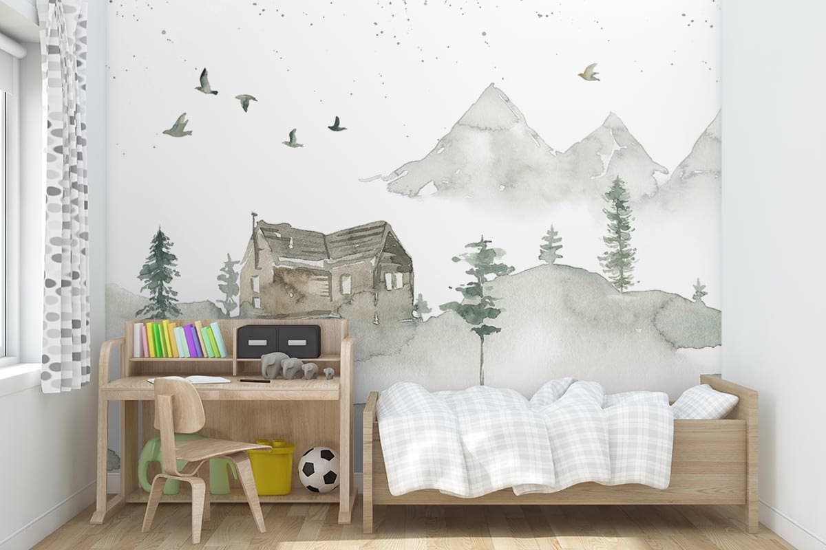 Dit behang is perfect voor rustige kinderkamer in witte en neutrale tinten. Je kindje kan heerlijk wegdromen bij dit natuurlijke aquarel landschap.