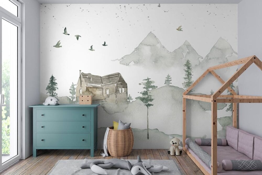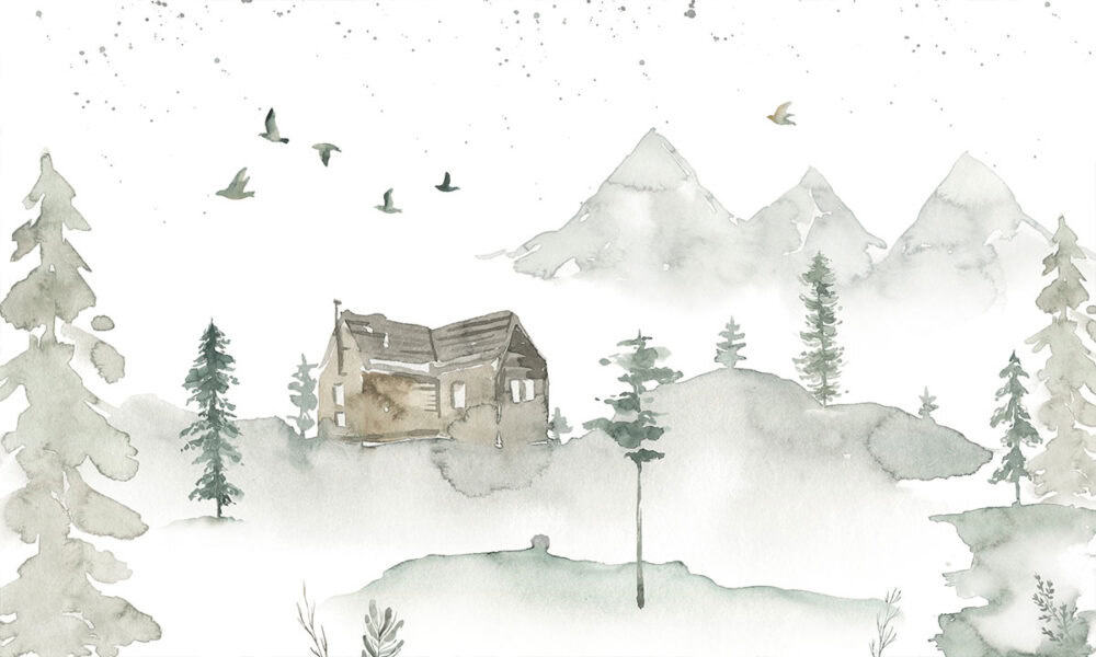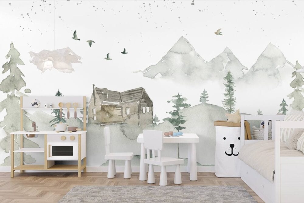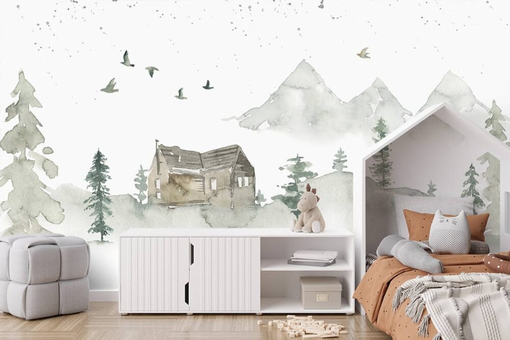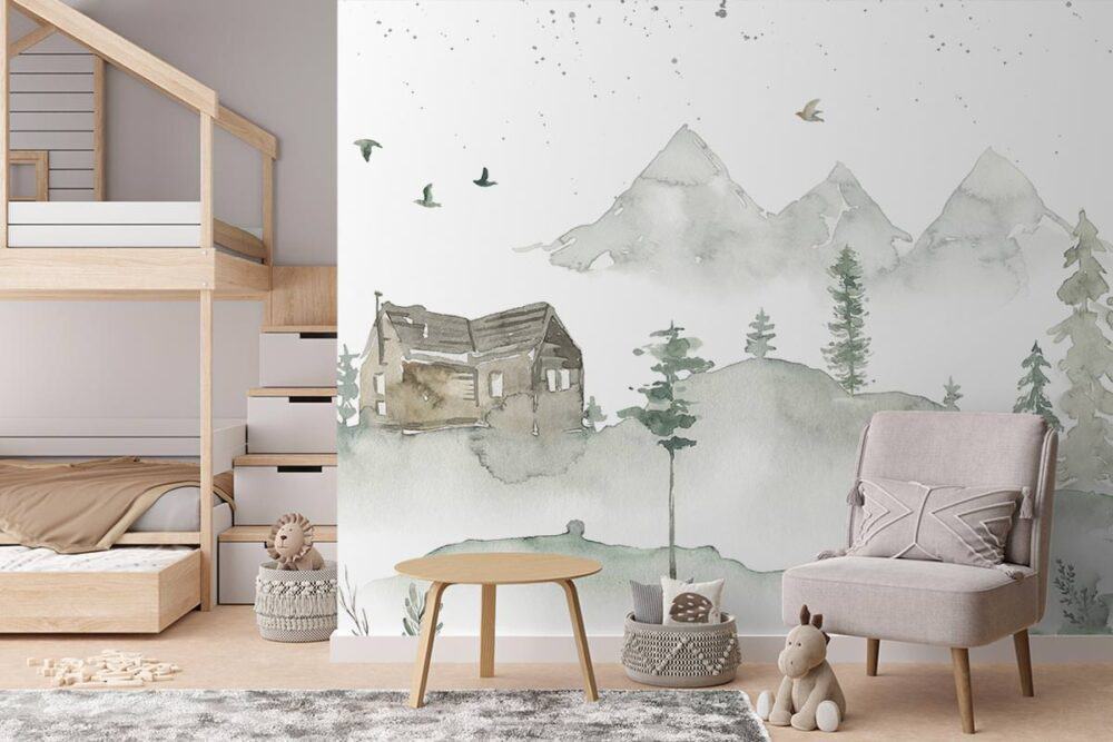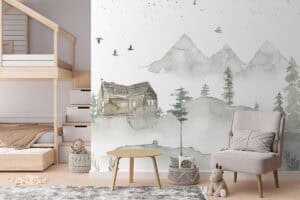 Dit behang is perfect voor rustige kinderkamer in witte en neutrale tinten. Je kindje kan heerlijk wegdromen bij dit natuurlijke aquarel landschap.