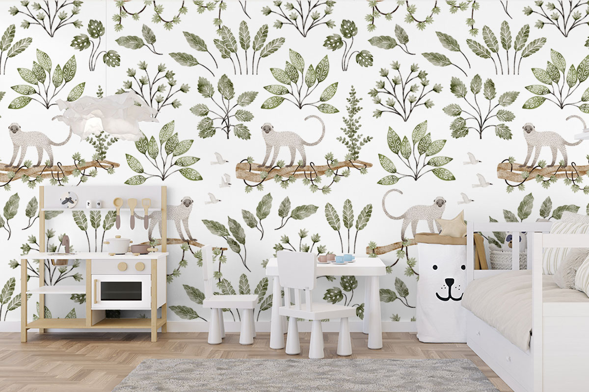 Wil je naast het behang ook een muur in de baby- of kinderkamer verven? Wij hebben alvast 3 Flexa Pure kleuren geselecteerd die perfect passen bij dit fotobehang Avontuur in de tropen.