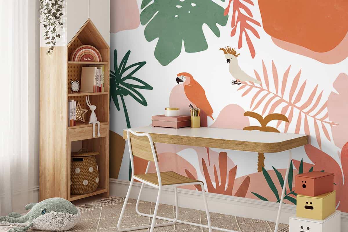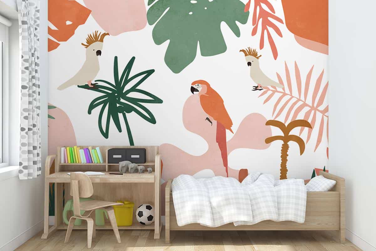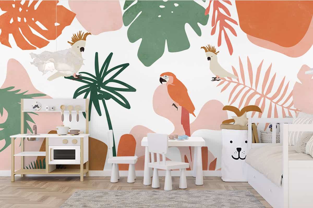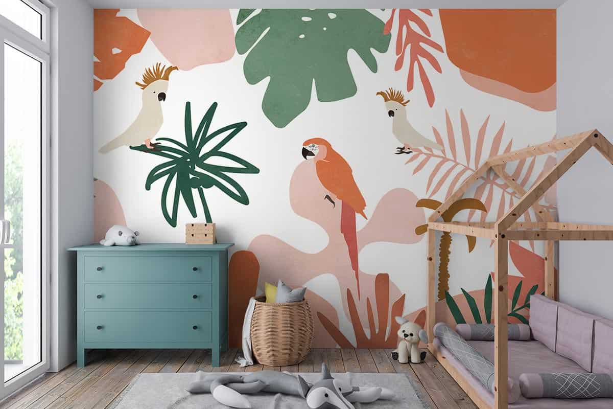 Wil je naast het behang ook een muur in de baby- of kinderkamer verven? Wij hebben alvast 3 Flexa Pure kleuren geselecteerd die perfect passen bij dit fotobehang Boho papegaaien.