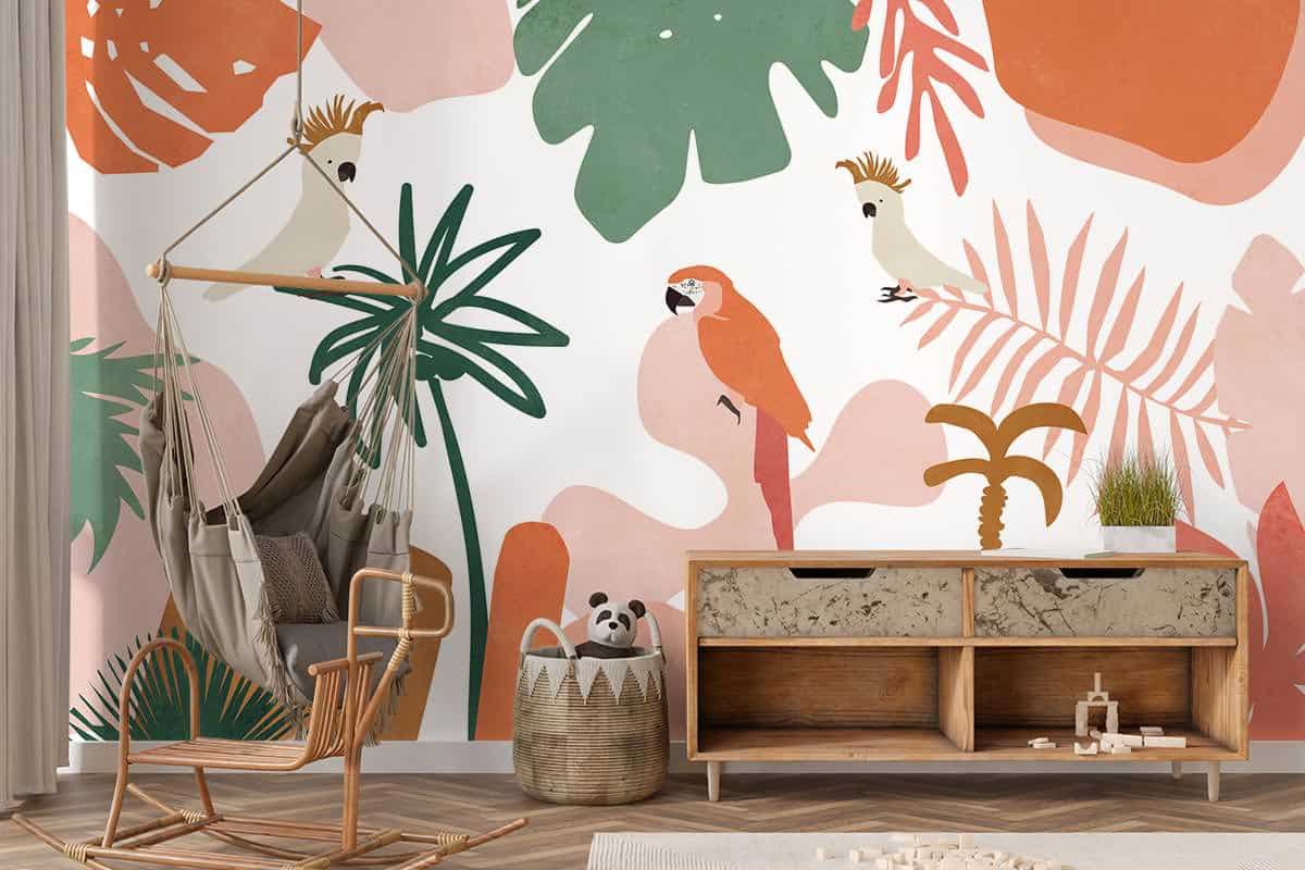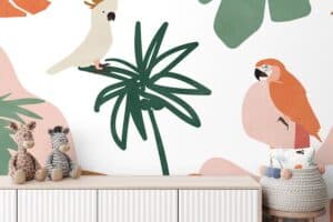 Wil je naast het behang ook een muur in de baby- of kinderkamer verven? Wij hebben alvast 3 Flexa Pure kleuren geselecteerd die perfect passen bij dit fotobehang Boho papegaaien.
