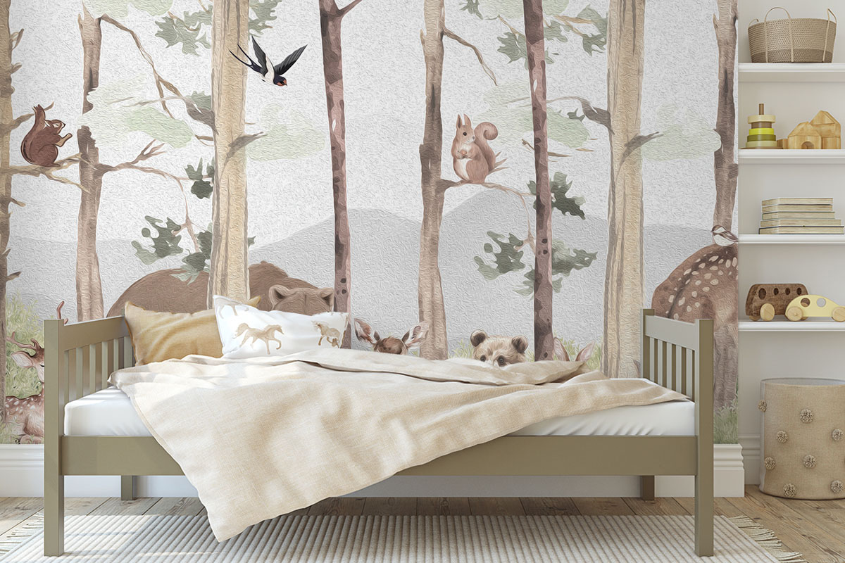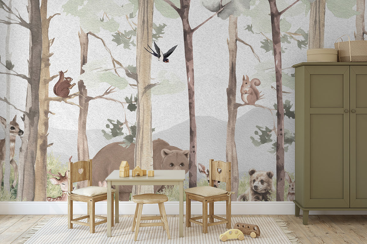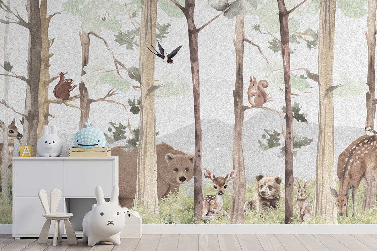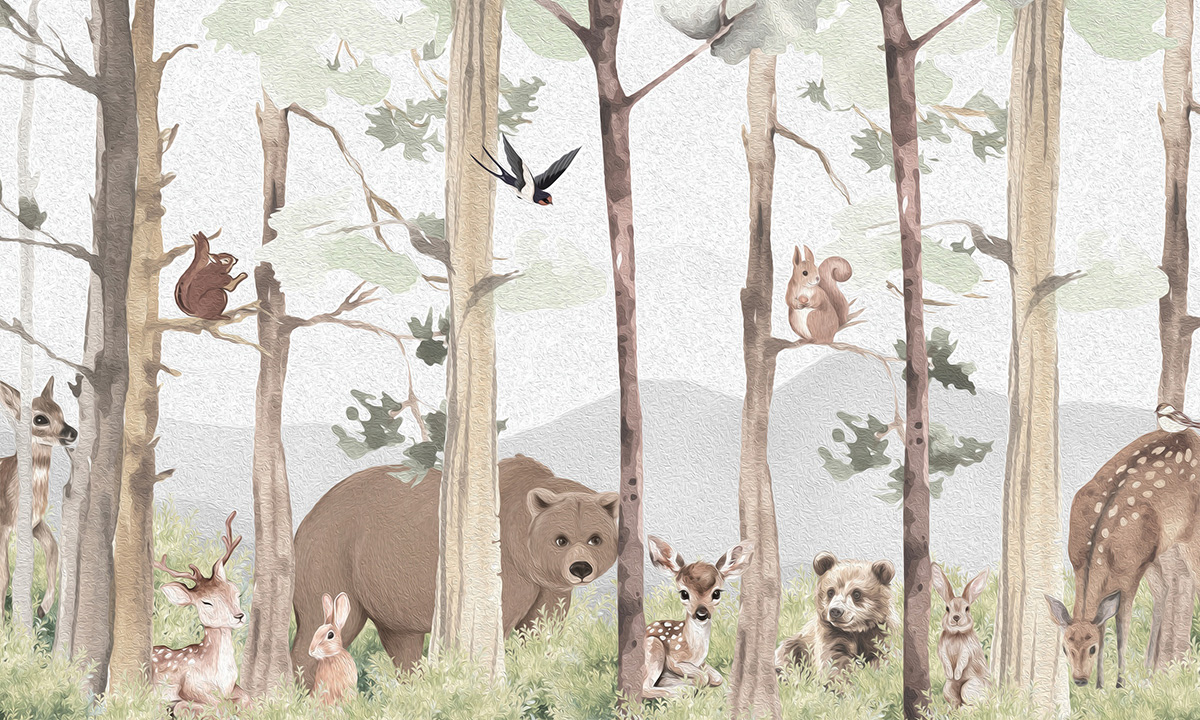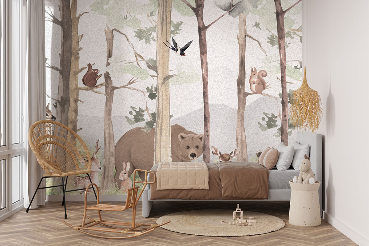 Lief bosmotief met beer, hertjes en eekhoorns in aquarelstijl. Zachte aardetinten op lichtgrijs.