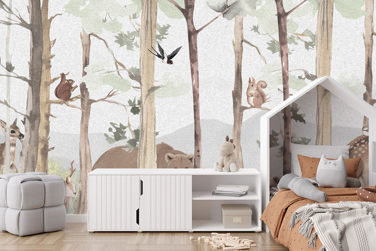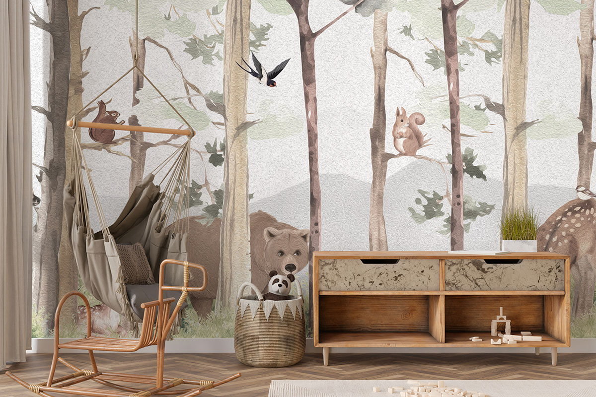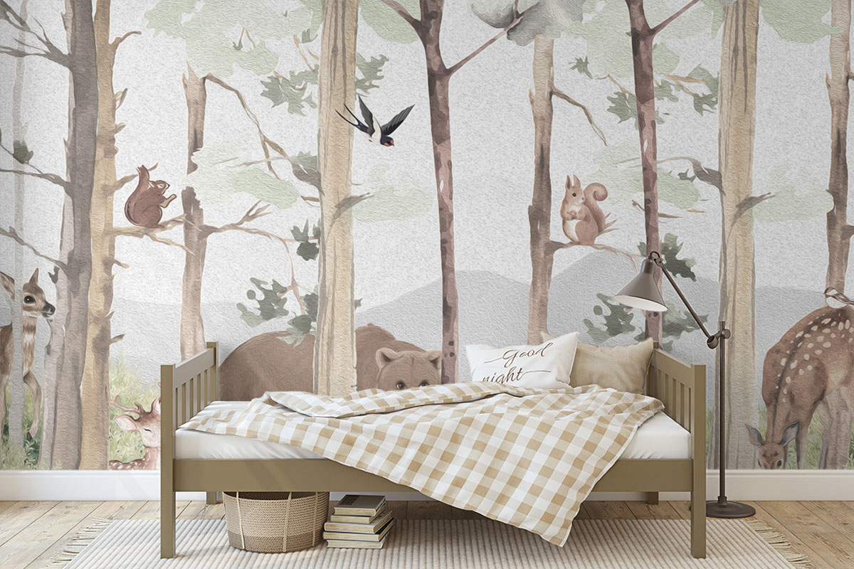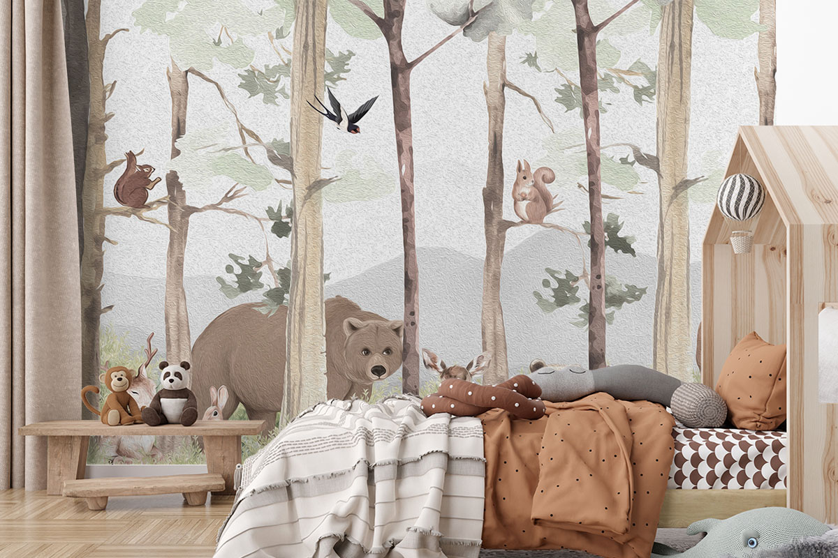 Lief bosmotief met beer, hertjes en eekhoorns in aquarelstijl. Zachte aardetinten op lichtgrijs.