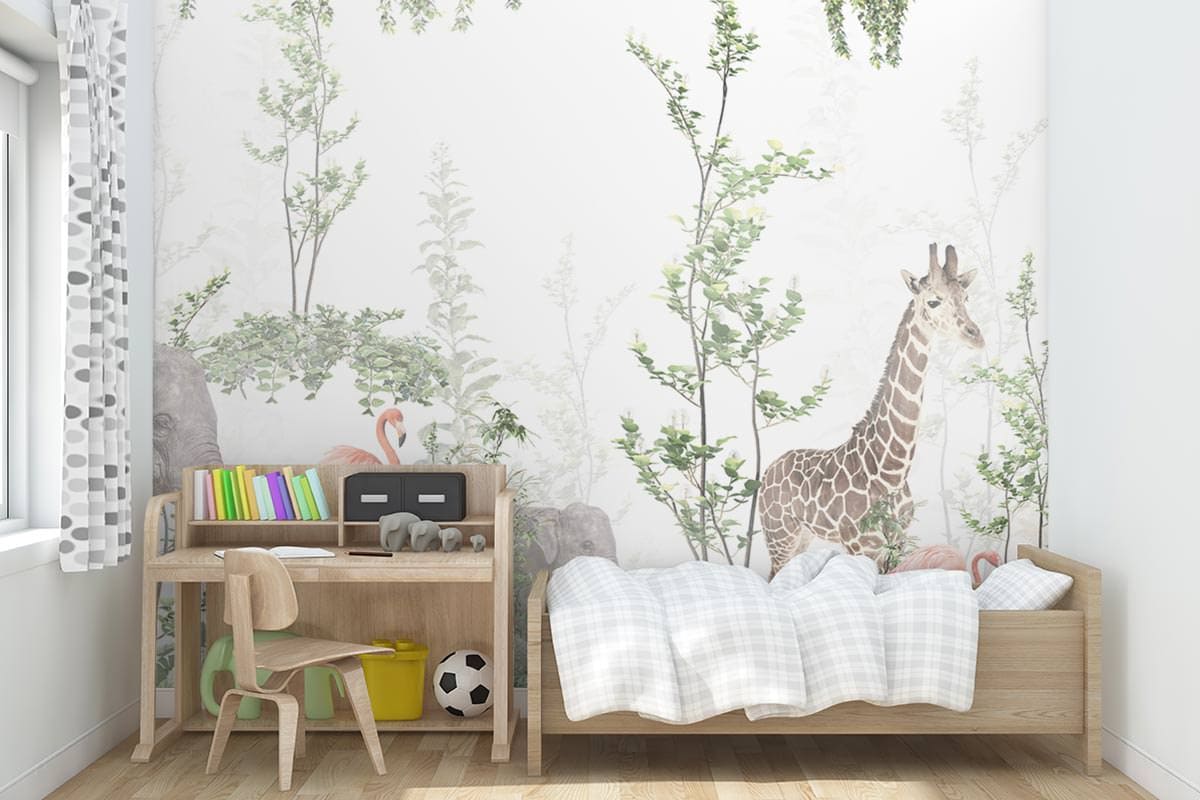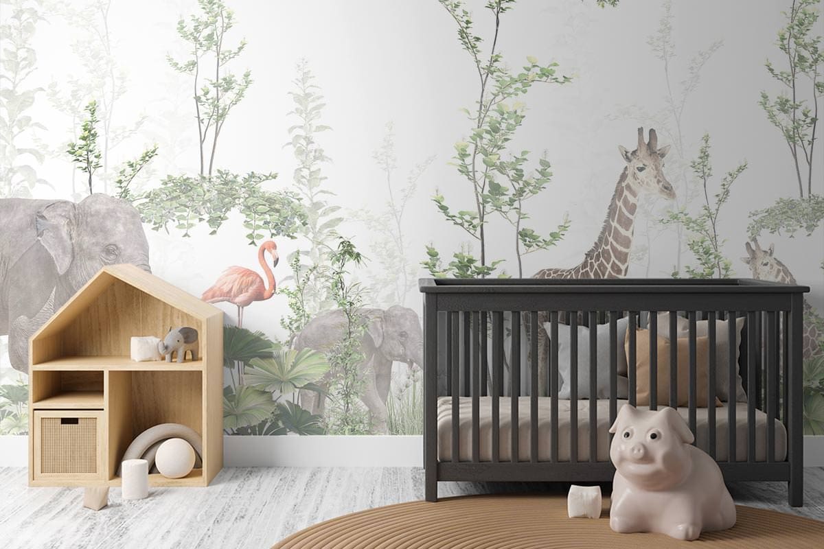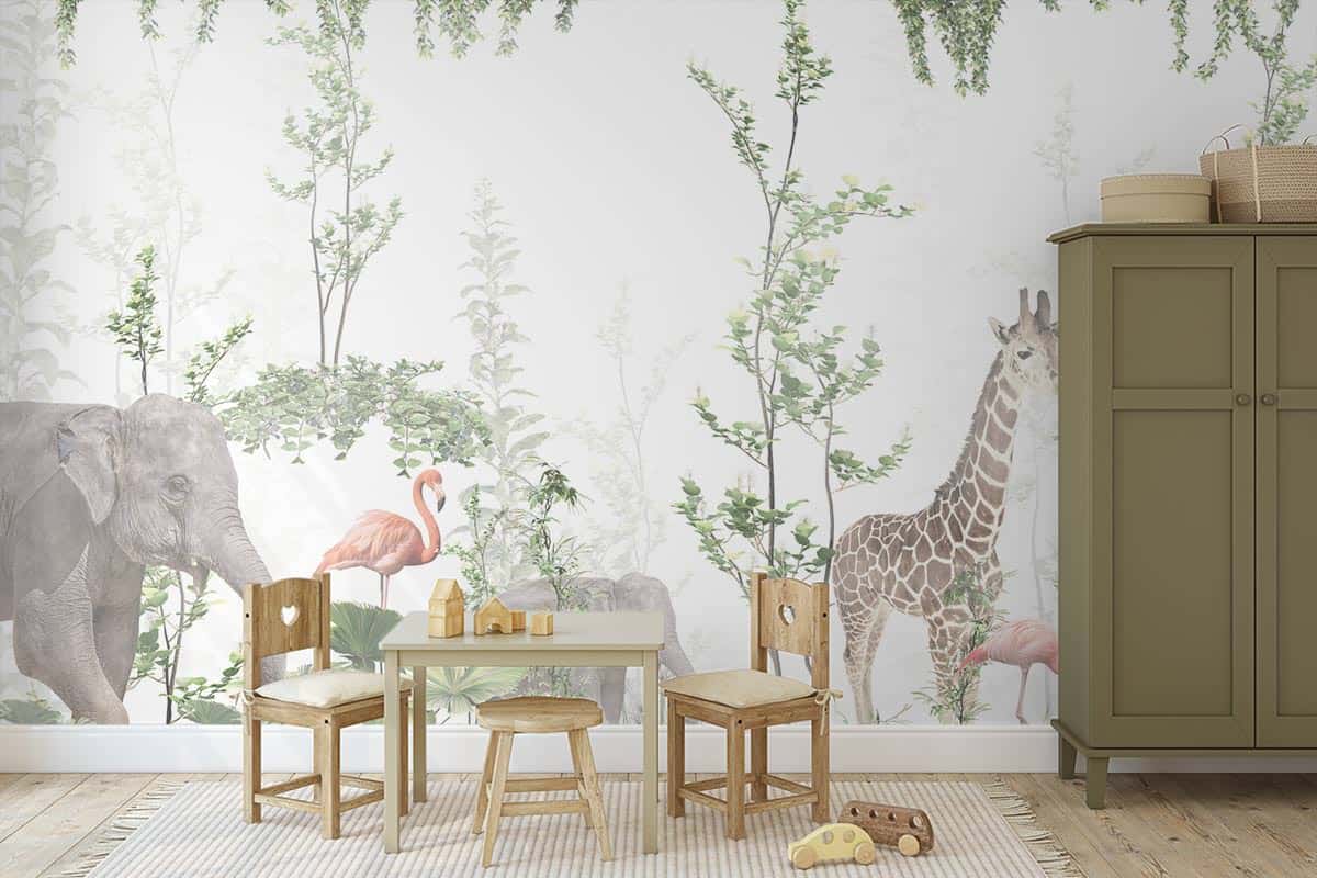 Wil je naast het behang ook een muur in de baby- of kinderkamer verven? Wij hebben alvast 3 Flexa Pure kleuren geselecteerd die perfect passen bij dit fotobehang Dieren in de groene oase.