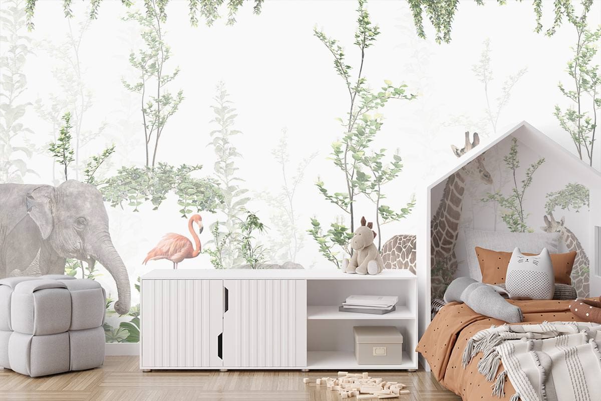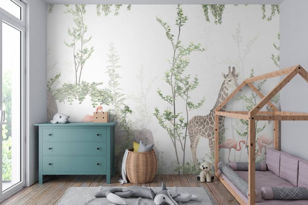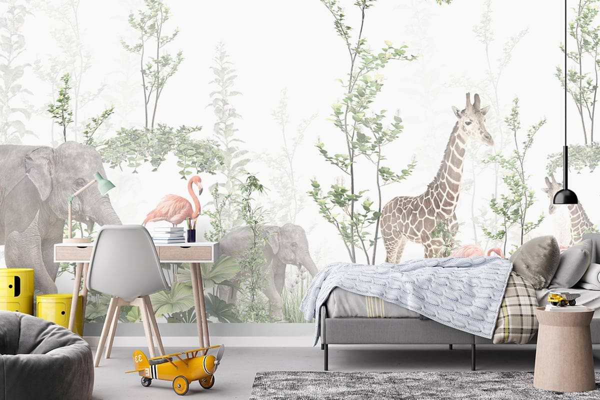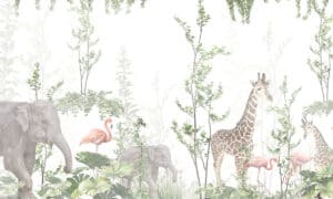 Wil je naast het behang ook een muur in de baby- of kinderkamer verven? Wij hebben alvast 3 Flexa Pure kleuren geselecteerd die perfect passen bij dit fotobehang Dieren in de groene oase.
