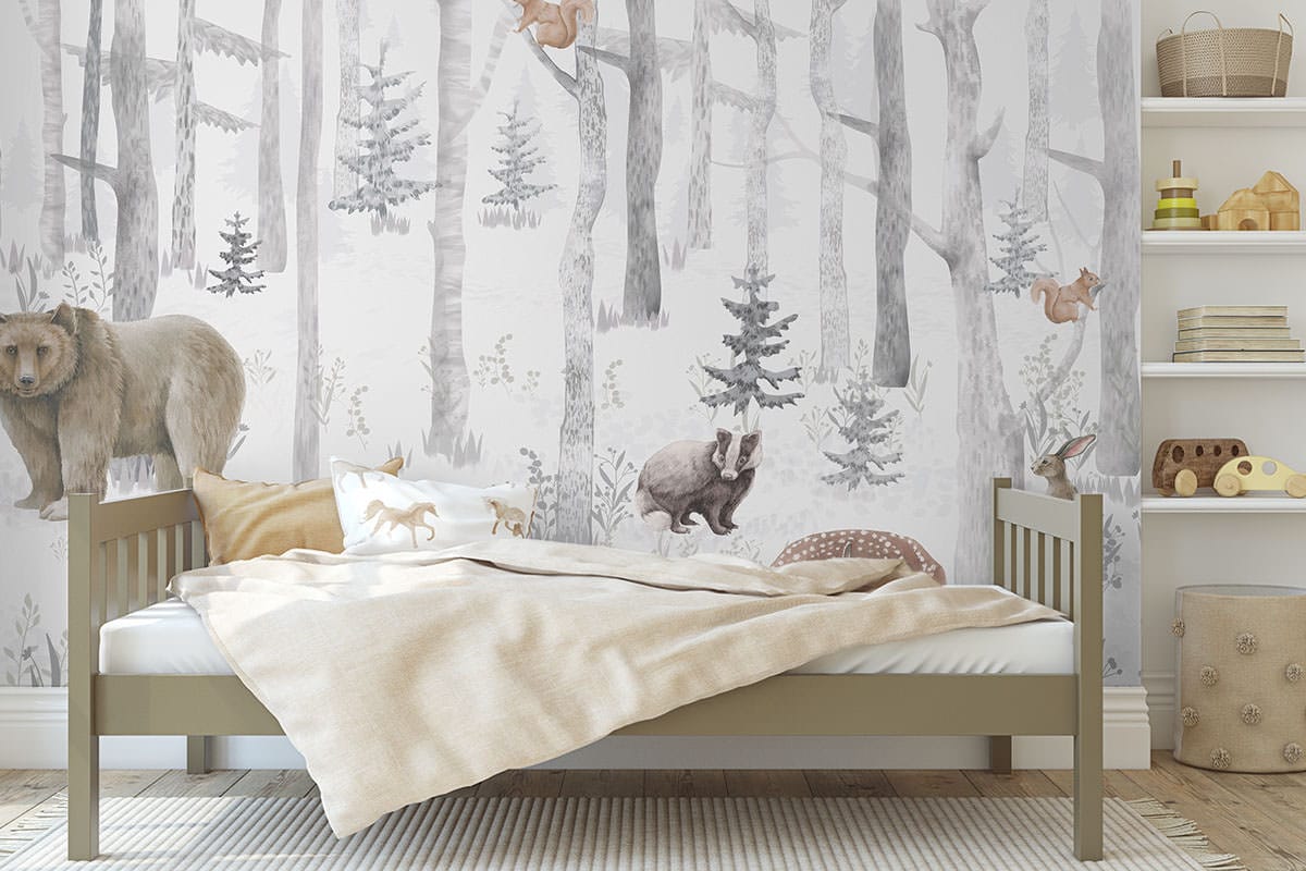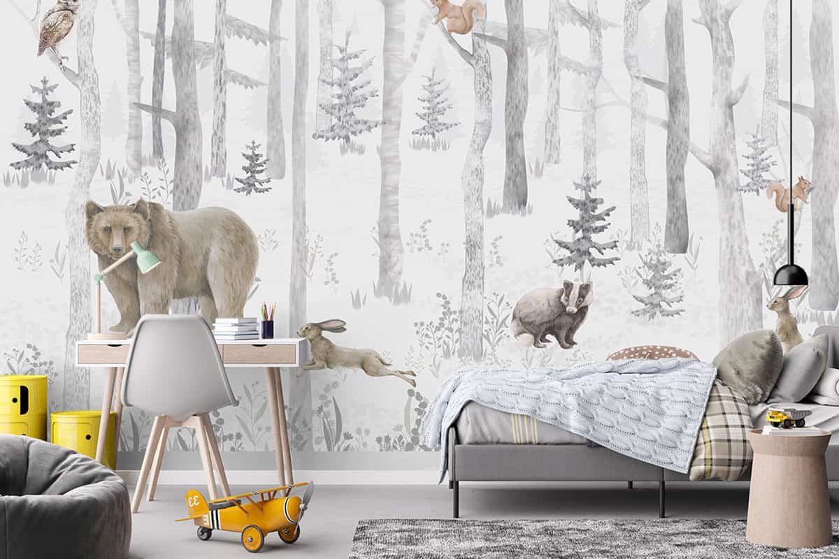 Wil je naast het behang ook een muur in de baby- of kinderkamer verven? Wij hebben alvast 3 Flexa Pure kleuren geselecteerd die perfect passen bij dit fotobehang Dieren in het winterbos.