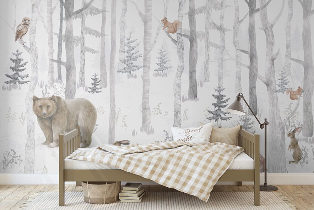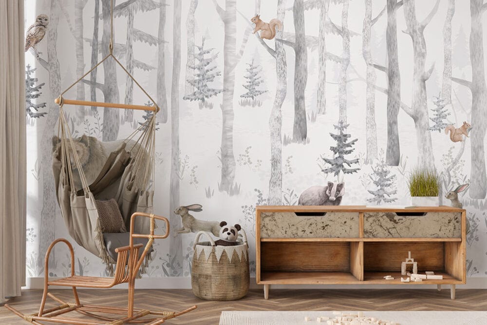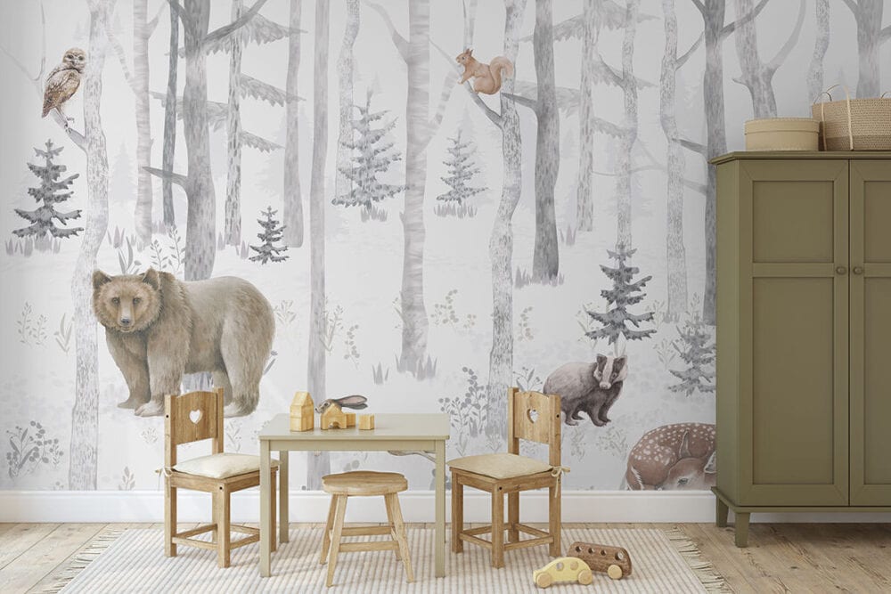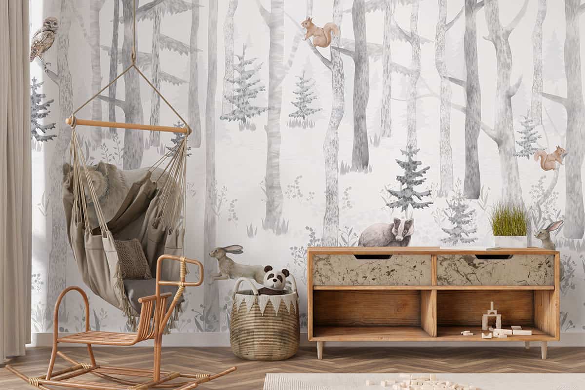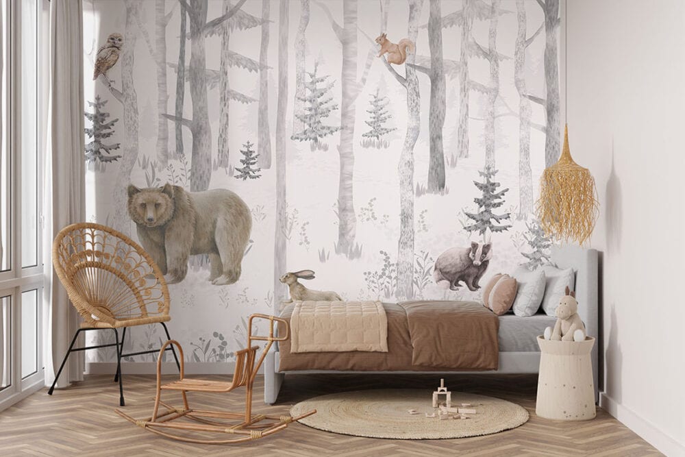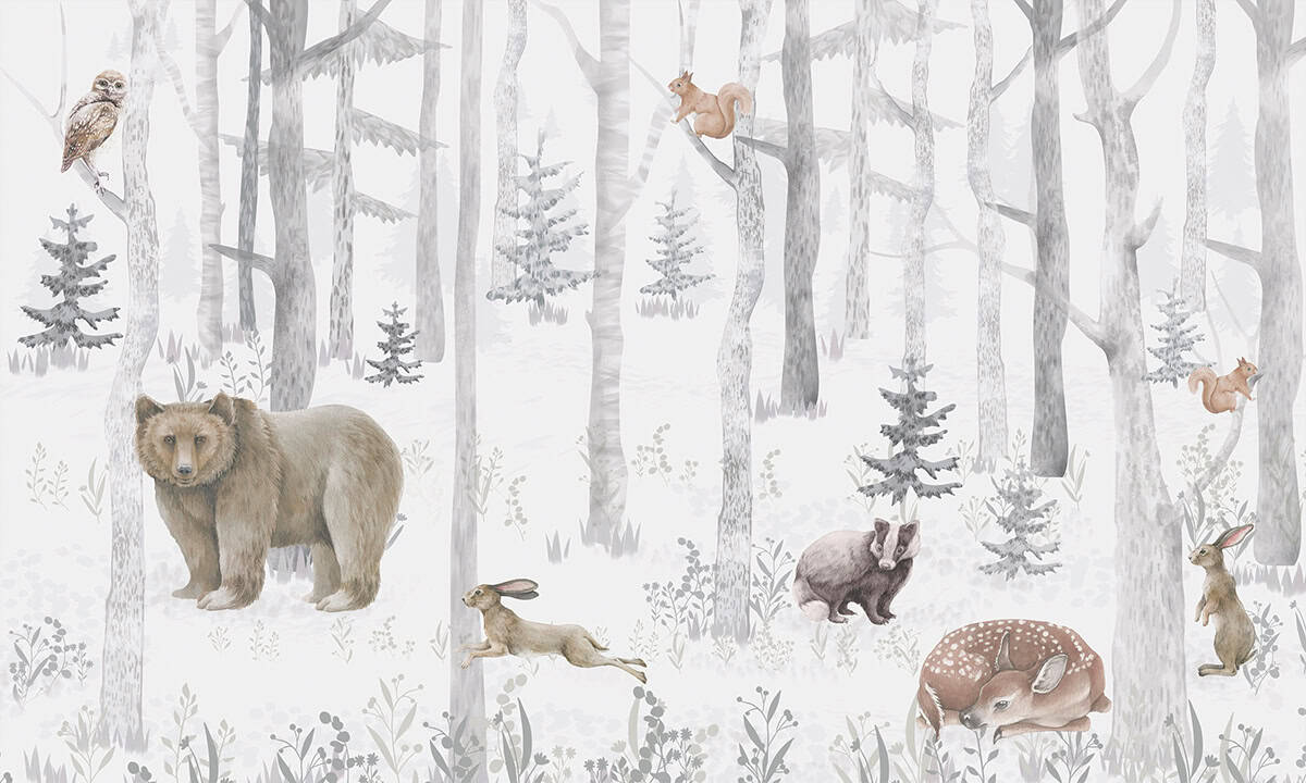 Wil je naast het behang ook een muur in de baby- of kinderkamer verven? Wij hebben alvast 3 Flexa Pure kleuren geselecteerd die perfect passen bij dit fotobehang Dieren in het winterbos.