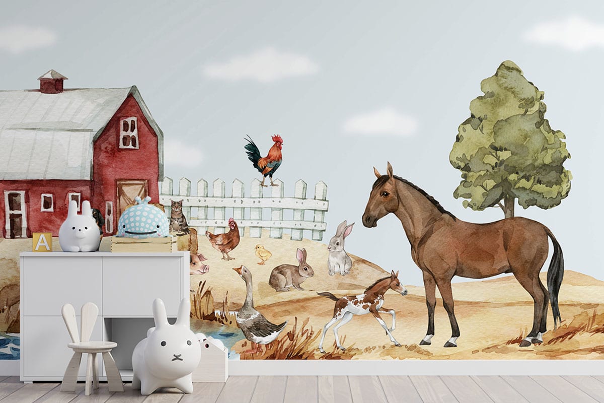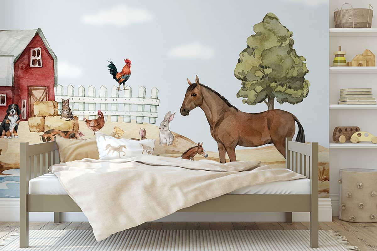 Jouw design Dierenleven op de boerderij wordt geprint op hoogwaardig duurzaam vliesbehang van premium kwaliteit. Dit stevige behang (200 g/m²) is krasvast, robuust en blijft jarenlang mooi — perfect voor in de kinderkamer, babykamer of speelkamer. Je kunt het behang helemaal op maat laten maken, zodat het ontwerp precies past op jouw muur. Dankzij de gladde afwerking en strakke structuur komt elk detail van het ontwerp perfect tot zijn recht.