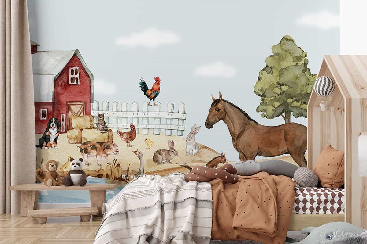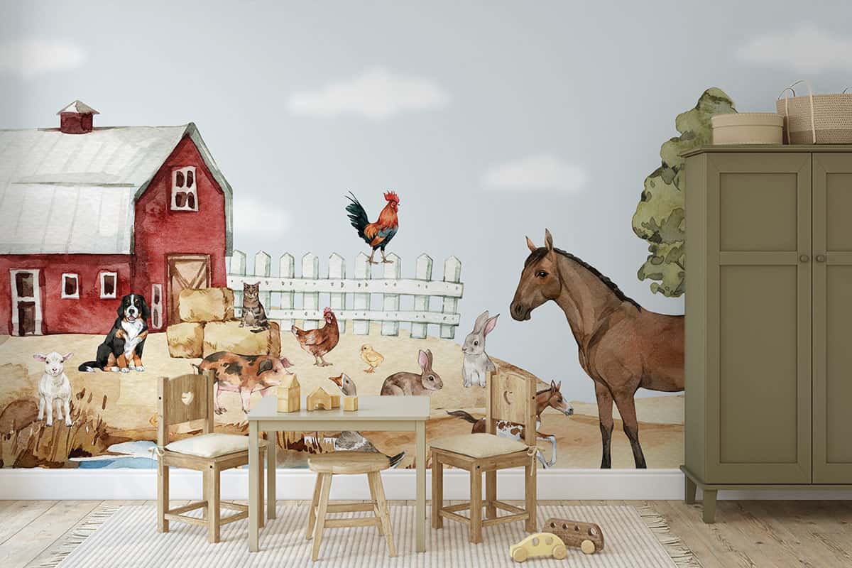 Wil je naast het behang ook een muur in de baby- of kinderkamer verven? Wij hebben alvast 3 Flexa Pure kleuren geselecteerd die perfect passen bij dit fotobehang Dierenleven op de boerderij.