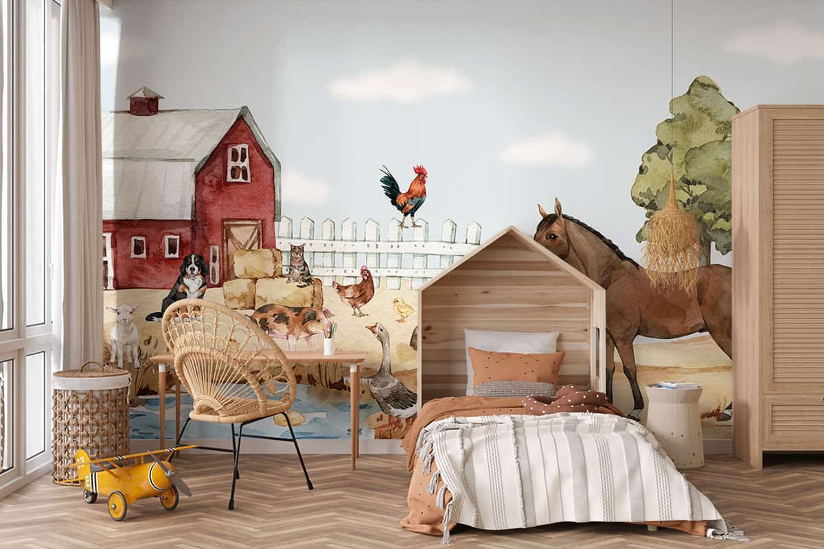 Jouw design Dierenleven op de boerderij wordt geprint op hoogwaardig duurzaam vliesbehang van premium kwaliteit. Dit stevige behang (200 g/m²) is krasvast, robuust en blijft jarenlang mooi — perfect voor in de kinderkamer, babykamer of speelkamer. Je kunt het behang helemaal op maat laten maken, zodat het ontwerp precies past op jouw muur. Dankzij de gladde afwerking en strakke structuur komt elk detail van het ontwerp perfect tot zijn recht.