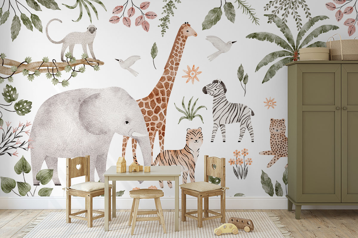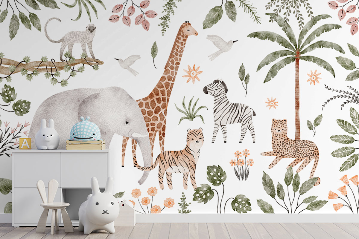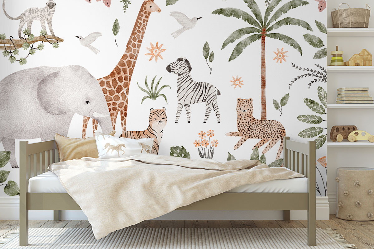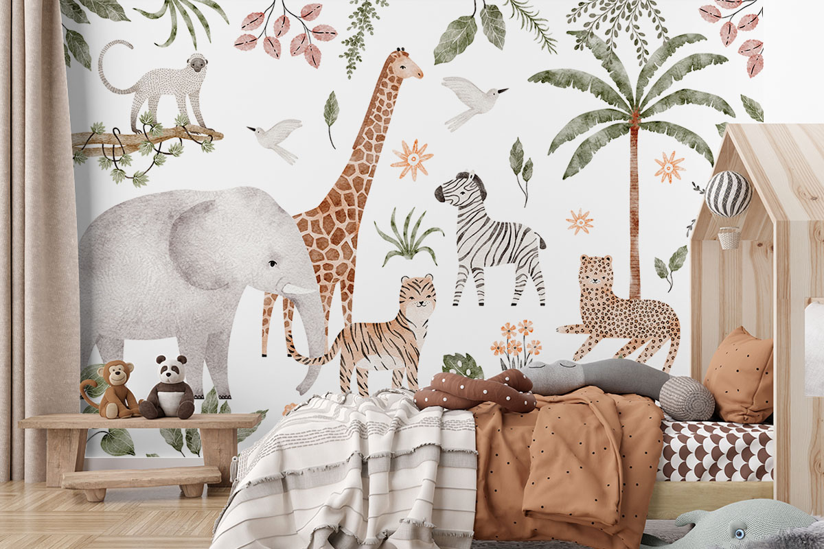 Een vrolijke stoet van savannedieren vult dit tropische tafereel. Een echte blikvanger voor de kinderkamer.