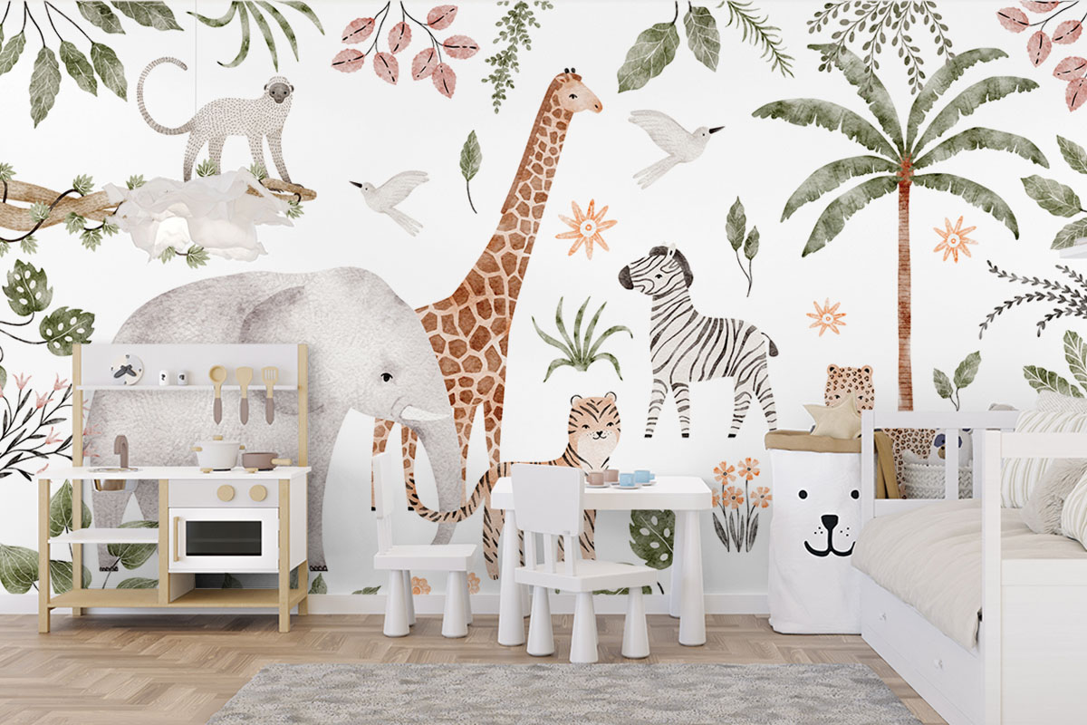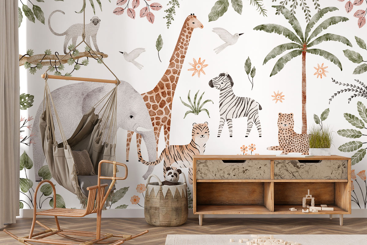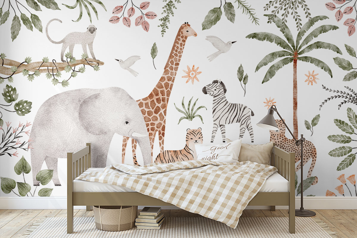 Een vrolijke stoet van savannedieren vult dit tropische tafereel. Een echte blikvanger voor de kinderkamer.