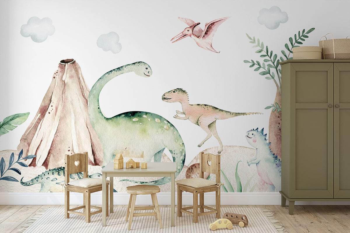 Wil je naast het behang ook een muur in de baby- of kinderkamer verven? Wij hebben alvast 3 Flexa Pure kleuren geselecteerd die perfect passen bij dit fotobehang Dino avontuur in de woestijn.