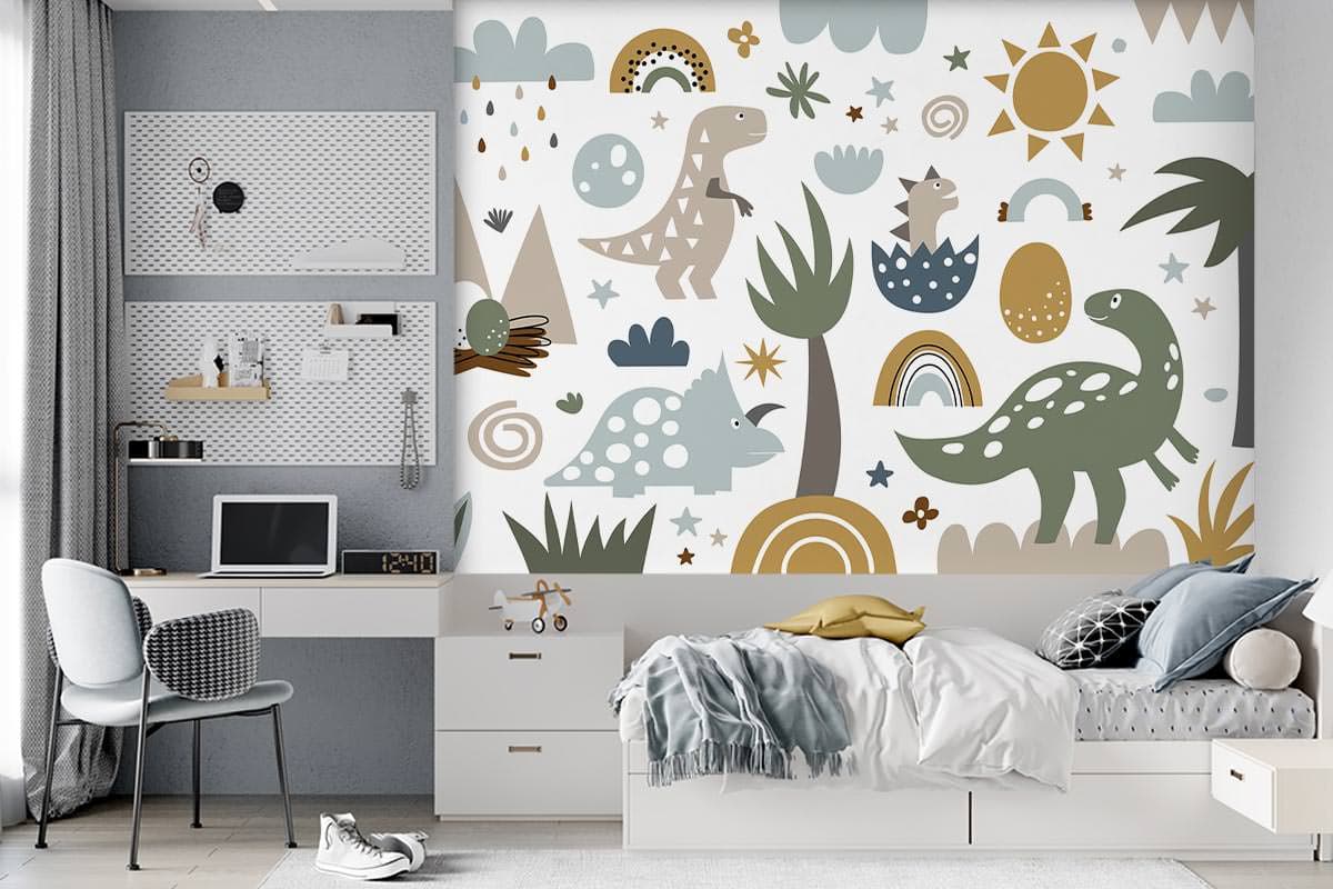 Jouw design Dinosaurussen tussen de palmbomen wordt geprint op hoogwaardig duurzaam vliesbehang van premium kwaliteit. Dit stevige behang (200 g/m²) is krasvast, robuust en blijft jarenlang mooi — perfect voor in de kinderkamer, babykamer of speelkamer. Je kunt het behang helemaal op maat laten maken, zodat het ontwerp precies past op jouw muur. Dankzij de gladde afwerking en strakke structuur komt elk detail van het ontwerp perfect tot zijn recht.