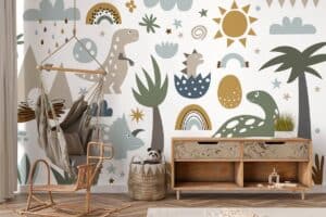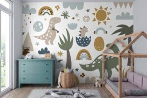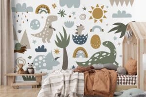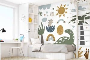 Jouw design Dinosaurussen tussen de palmbomen wordt geprint op hoogwaardig duurzaam vliesbehang van premium kwaliteit. Dit stevige behang (200 g/m²) is krasvast, robuust en blijft jarenlang mooi — perfect voor in de kinderkamer, babykamer of speelkamer. Je kunt het behang helemaal op maat laten maken, zodat het ontwerp precies past op jouw muur. Dankzij de gladde afwerking en strakke structuur komt elk detail van het ontwerp perfect tot zijn recht.