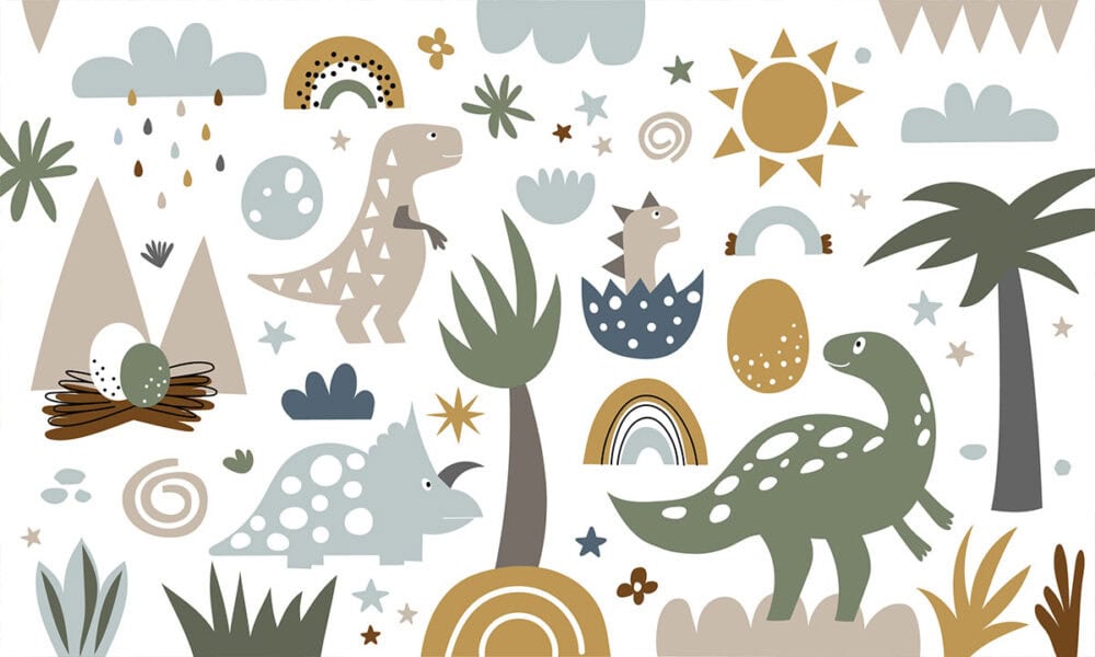 Wil je naast het behang ook een muur in de baby- of kinderkamer verven? Wij hebben alvast 3 Flexa Pure kleuren geselecteerd die perfect passen bij dit fotobehang Dinosaurussen tussen de palmbomen.