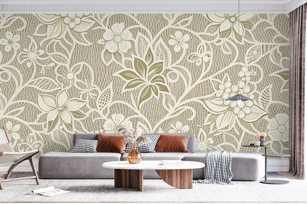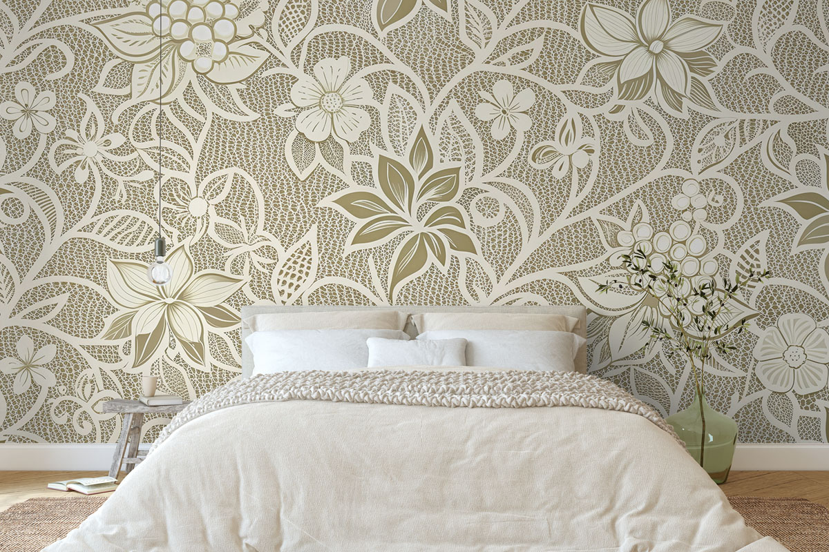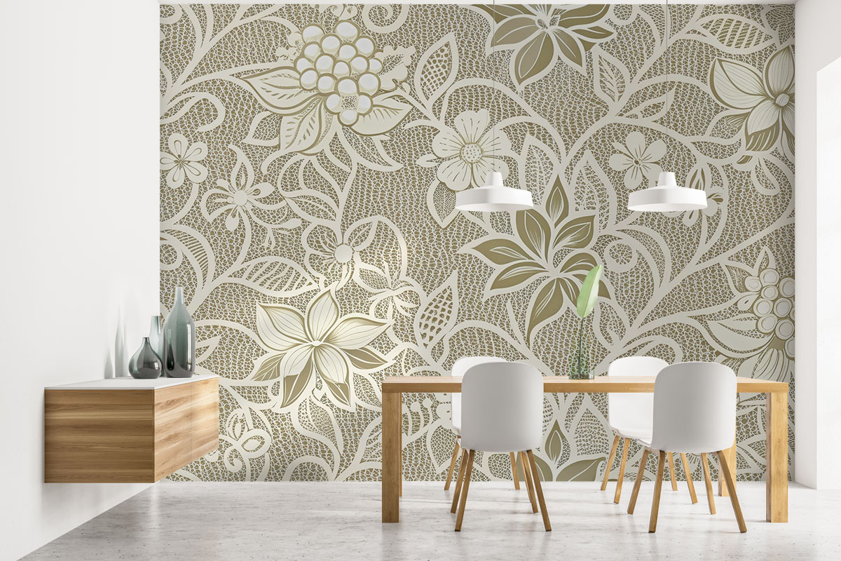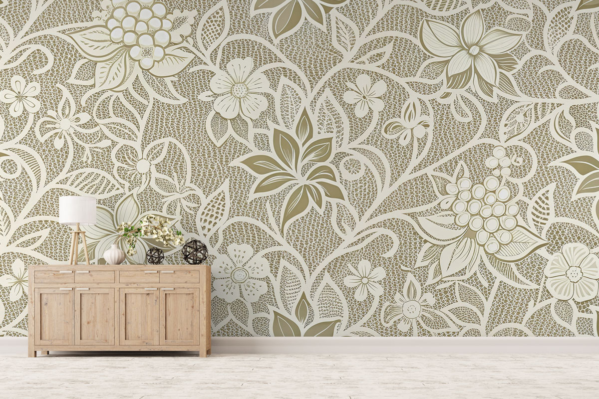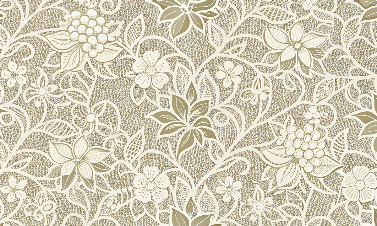 Kantachtig motief met druiventrossen en bloemenranken in taupe en olijfgroen. Fijn en klassiek.
