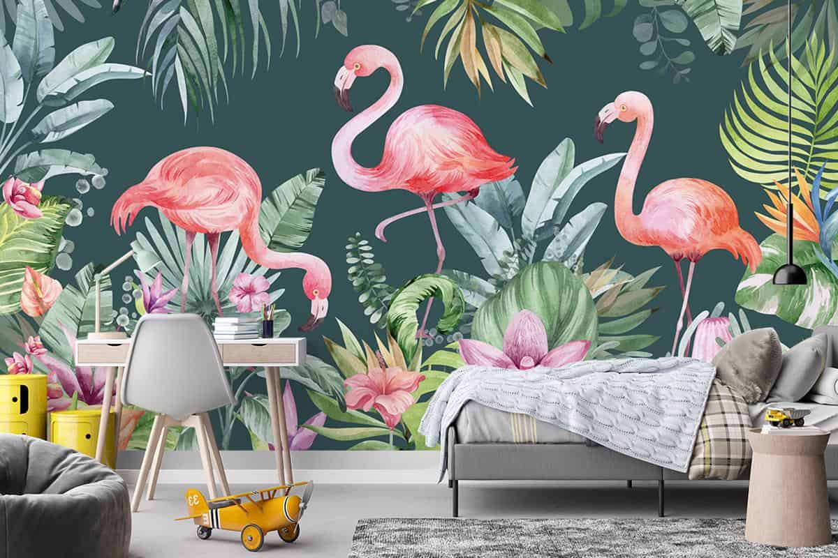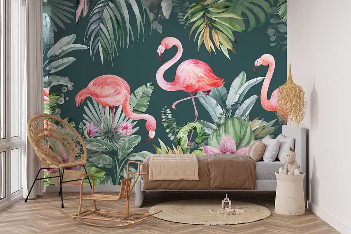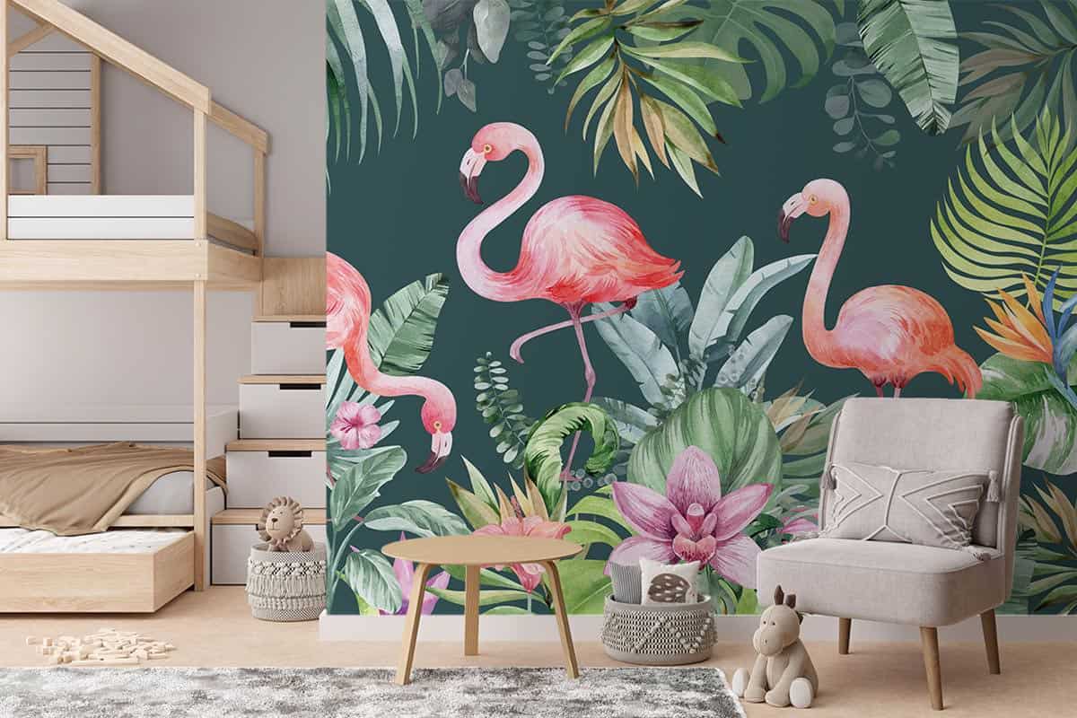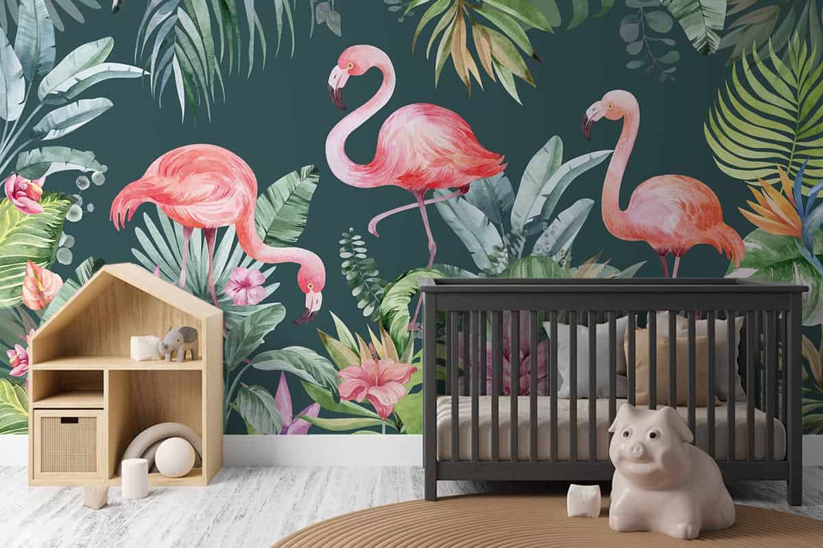 Wil je naast het behang ook een muur in de baby- of kinderkamer verven? Wij hebben alvast 3 Flexa Pure kleuren geselecteerd die perfect passen bij dit fotobehang Flamingo's in de tropen.