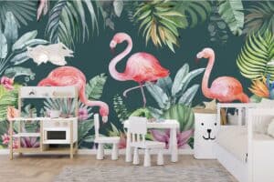 Jouw design Flamingo's in de tropen wordt geprint op hoogwaardig duurzaam vliesbehang van premium kwaliteit. Dit stevige behang (200 g/m²) is krasvast, robuust en blijft jarenlang mooi — perfect voor in de kinderkamer, babykamer of speelkamer. Je kunt het behang helemaal op maat laten maken, zodat het ontwerp precies past op jouw muur. Dankzij de gladde afwerking en strakke structuur komt elk detail van het ontwerp perfect tot zijn recht.