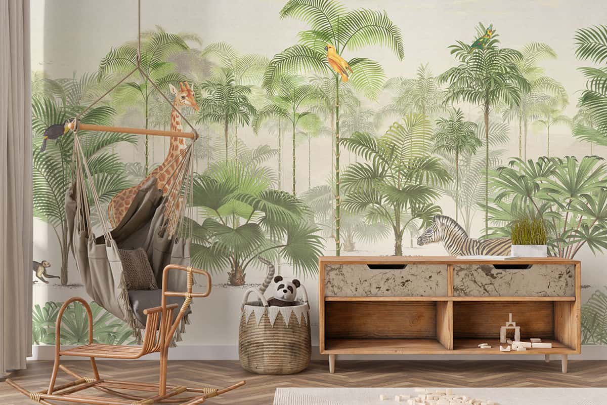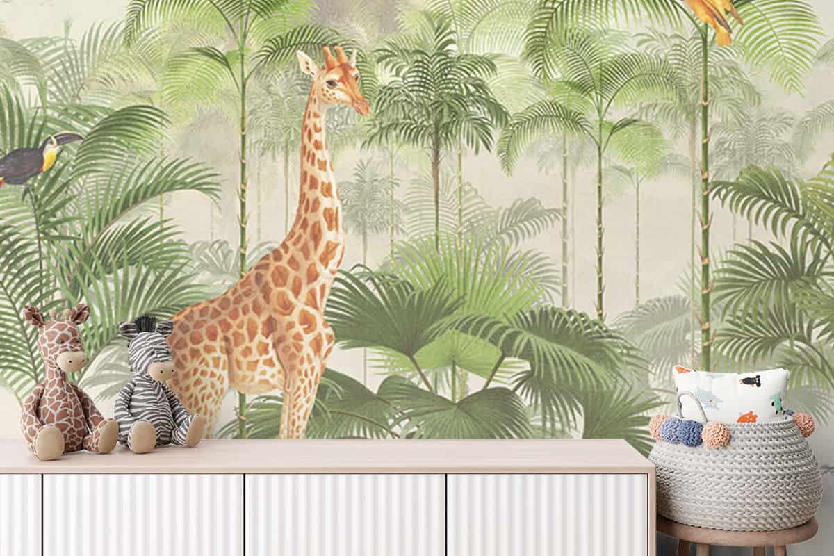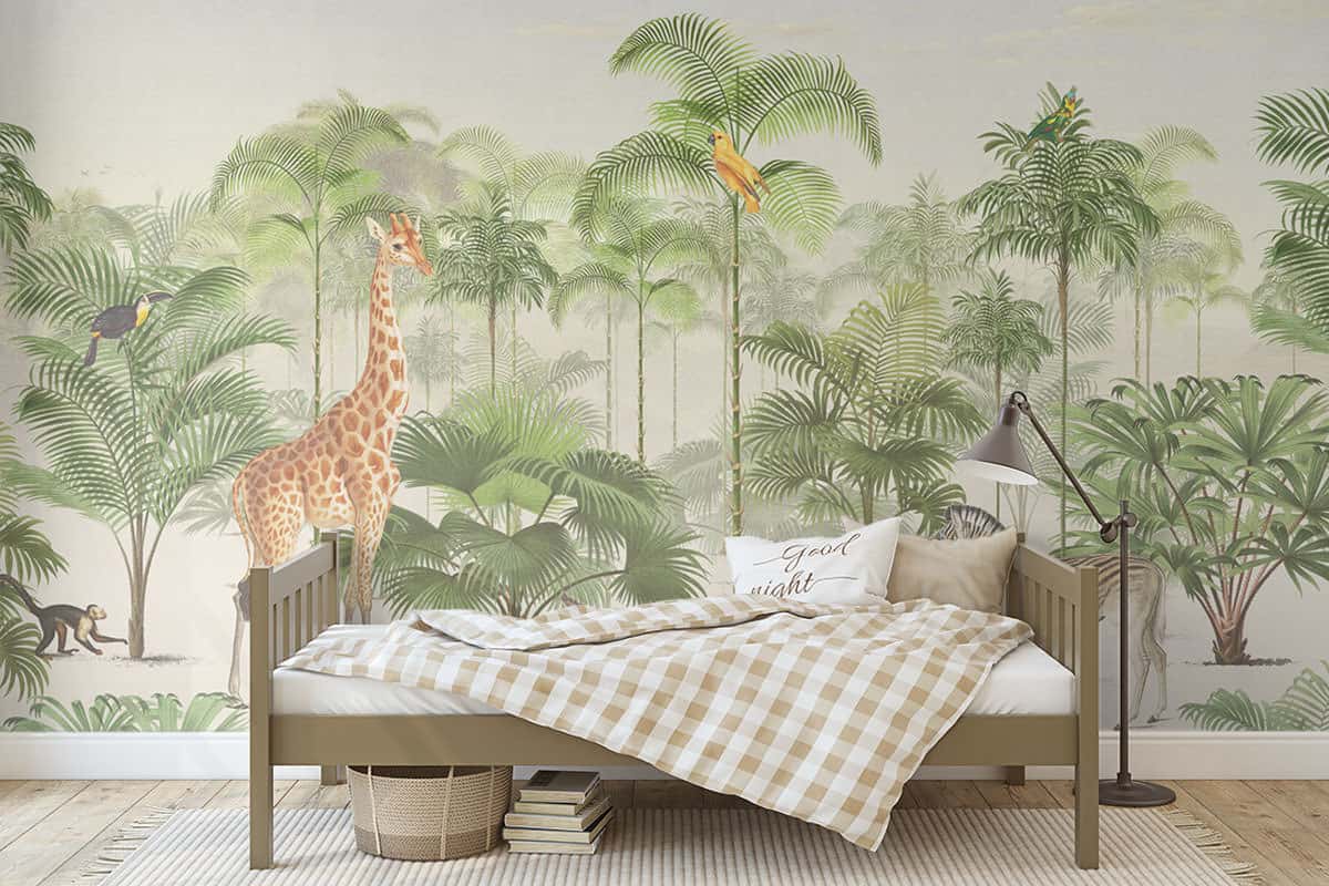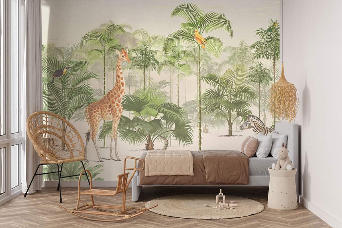Jouw design Giraf en zebra in de jungle wordt geprint op hoogwaardig duurzaam vliesbehang van premium kwaliteit. Dit stevige behang (200 g/m²) is krasvast, robuust en blijft jarenlang mooi — perfect voor in de kinderkamer, babykamer of speelkamer. Je kunt het behang helemaal op maat laten maken, zodat het ontwerp precies past op jouw muur. Dankzij de gladde afwerking en strakke structuur komt elk detail van het ontwerp perfect tot zijn recht.