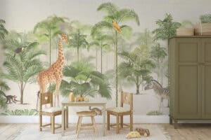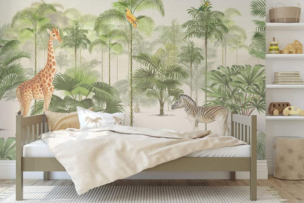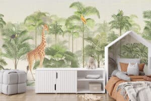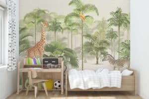 Jouw design Giraf en zebra in de jungle wordt geprint op hoogwaardig duurzaam vliesbehang van premium kwaliteit. Dit stevige behang (200 g/m²) is krasvast, robuust en blijft jarenlang mooi — perfect voor in de kinderkamer, babykamer of speelkamer. Je kunt het behang helemaal op maat laten maken, zodat het ontwerp precies past op jouw muur. Dankzij de gladde afwerking en strakke structuur komt elk detail van het ontwerp perfect tot zijn recht.