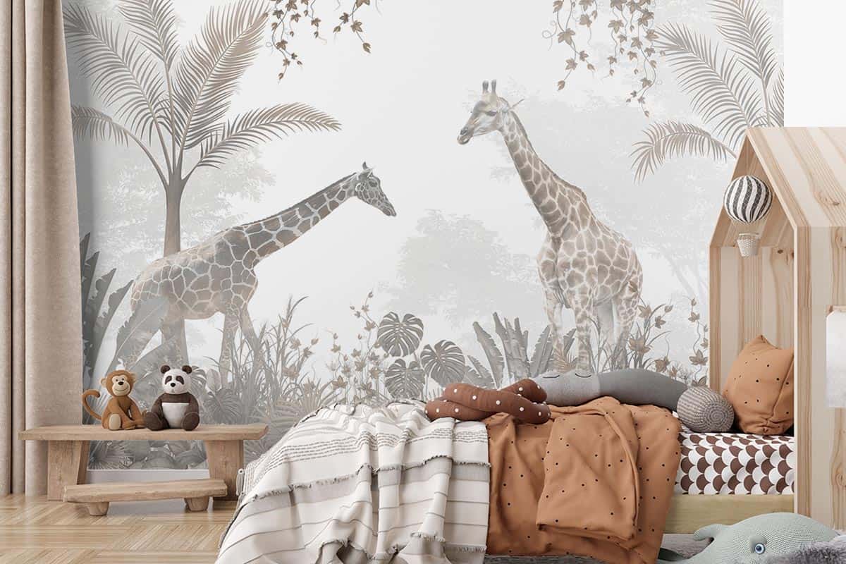 Wil je naast het behang ook een muur in de baby- of kinderkamer verven? Wij hebben alvast 3 Flexa Pure kleuren geselecteerd die perfect passen bij dit fotobehang Giraffen in het bos.