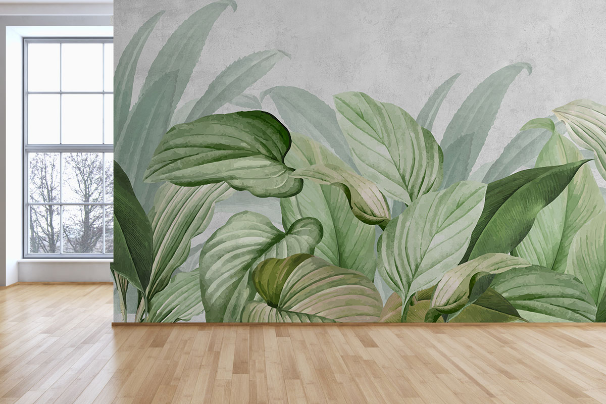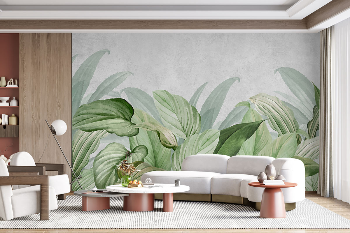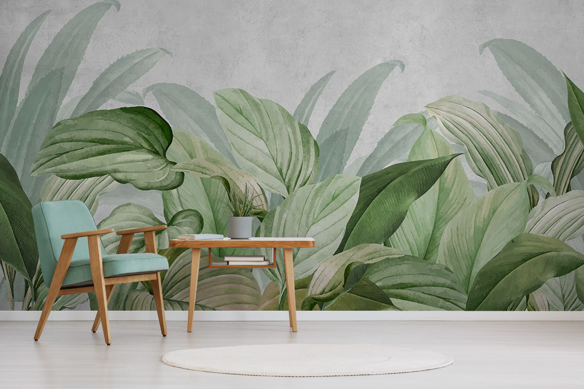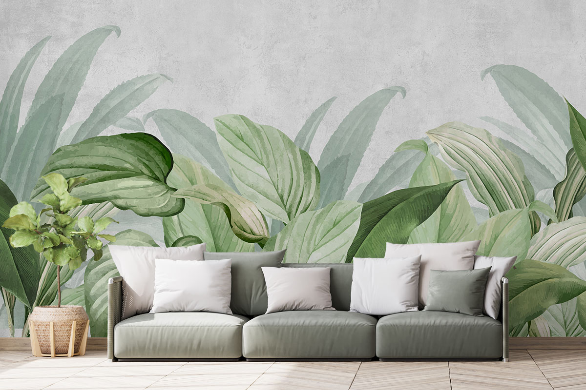 Zachte aquarelbladeren in verschillende groentinten creëren een kalme en frisse sfeer. Perfect voor elke ruimte.
