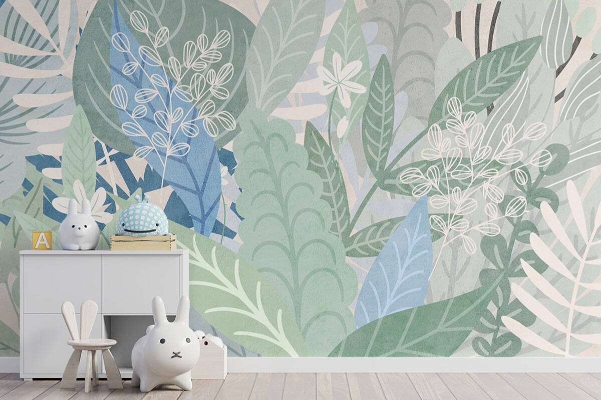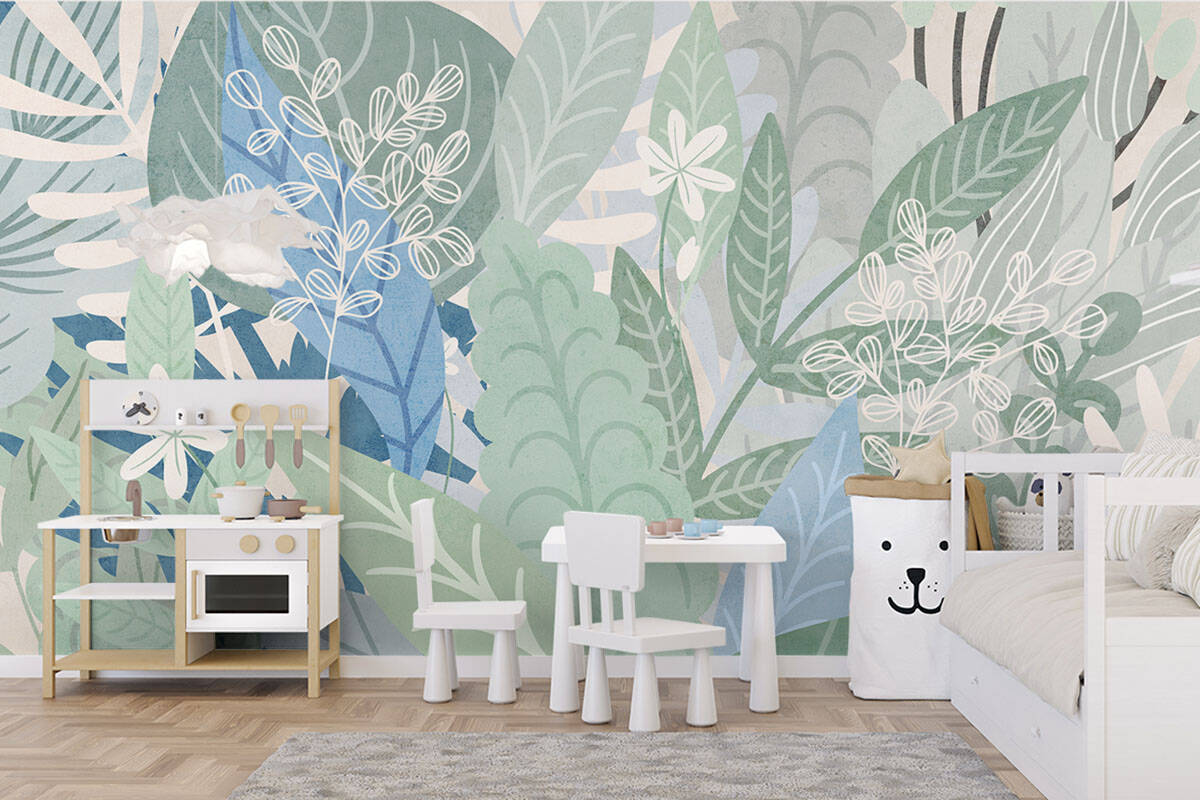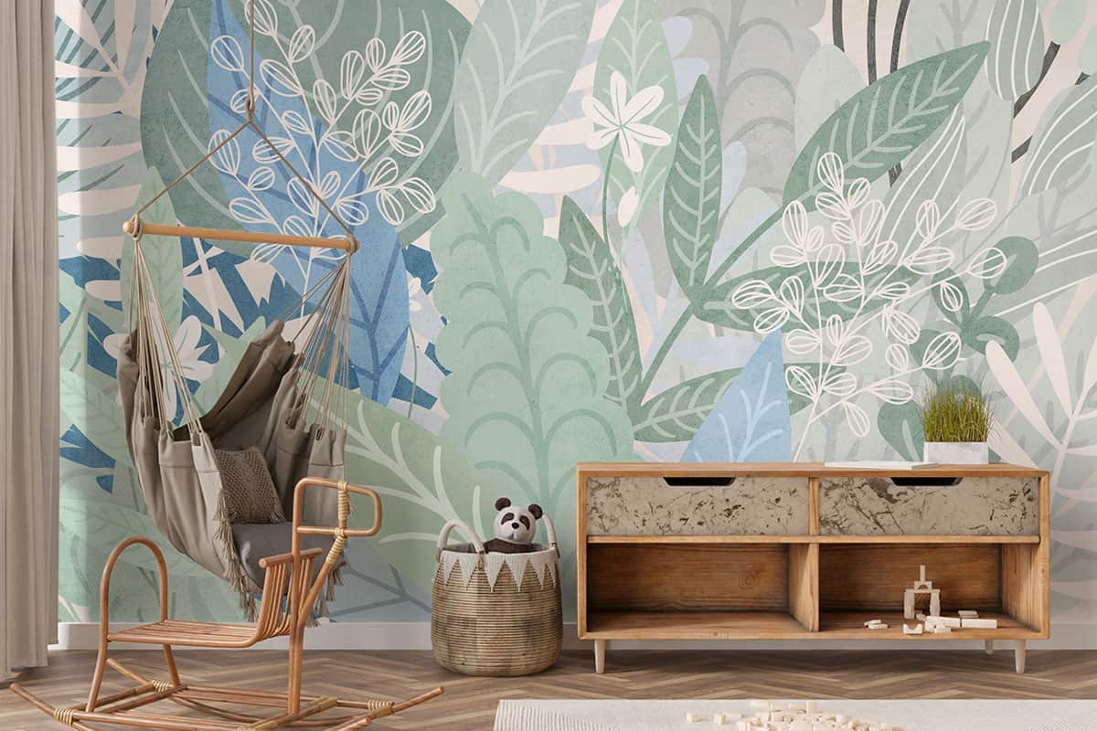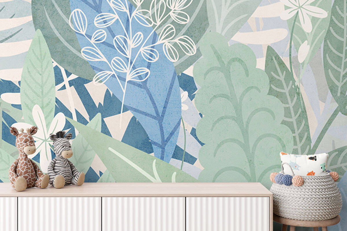Wil je naast het behang ook een muur in de baby- of kinderkamer verven? Wij hebben alvast 3 Flexa Pure kleuren geselecteerd die perfect passen bij dit fotobehang Groene en blauwe bladeren.