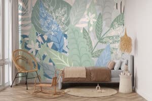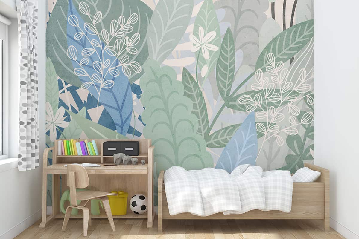 Dit kinderkamer behang met kleurrijke abstracte bladeren heeft een speelse look. Misschien wel precies wat jij zoekt voor jouw kinderkamer.
