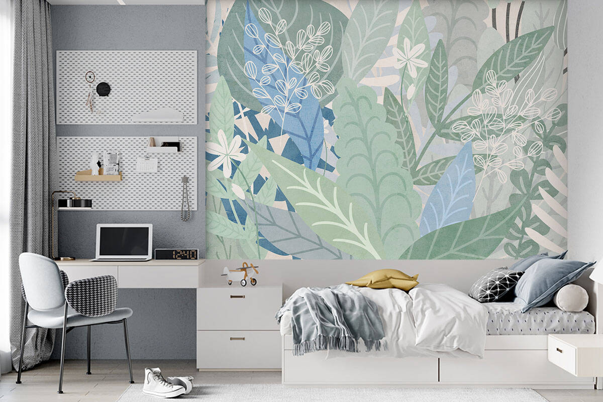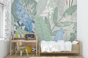 Jouw design Groene en blauwe bladeren wordt geprint op hoogwaardig duurzaam vliesbehang van premium kwaliteit. Dit stevige behang (200 g/m²) is krasvast, robuust en blijft jarenlang mooi — perfect voor in de kinderkamer, babykamer of speelkamer. Je kunt het behang helemaal op maat laten maken, zodat het ontwerp precies past op jouw muur. Dankzij de gladde afwerking en strakke structuur komt elk detail van het ontwerp perfect tot zijn recht.