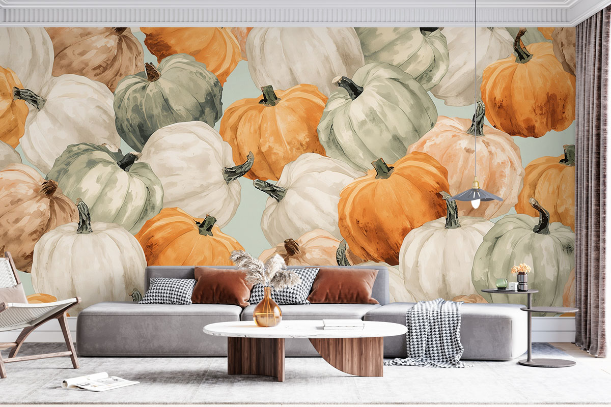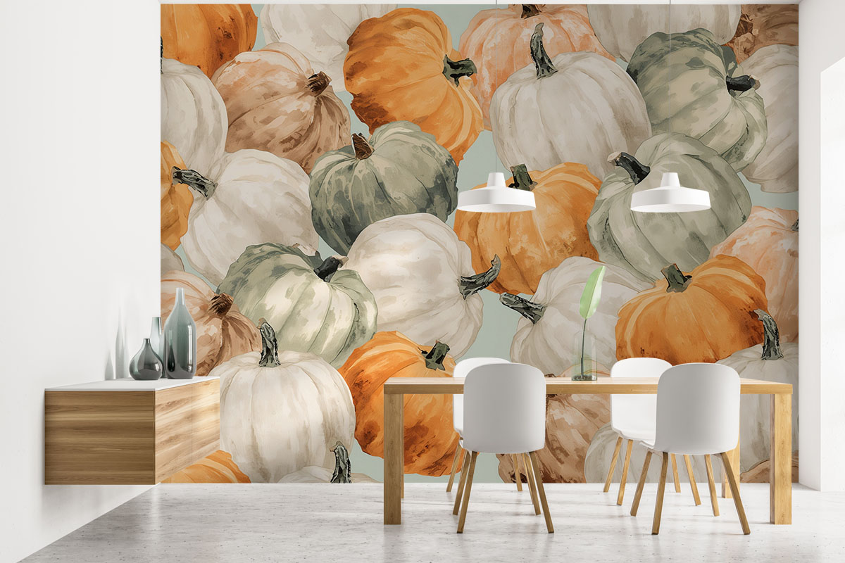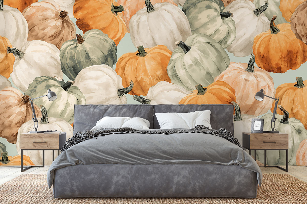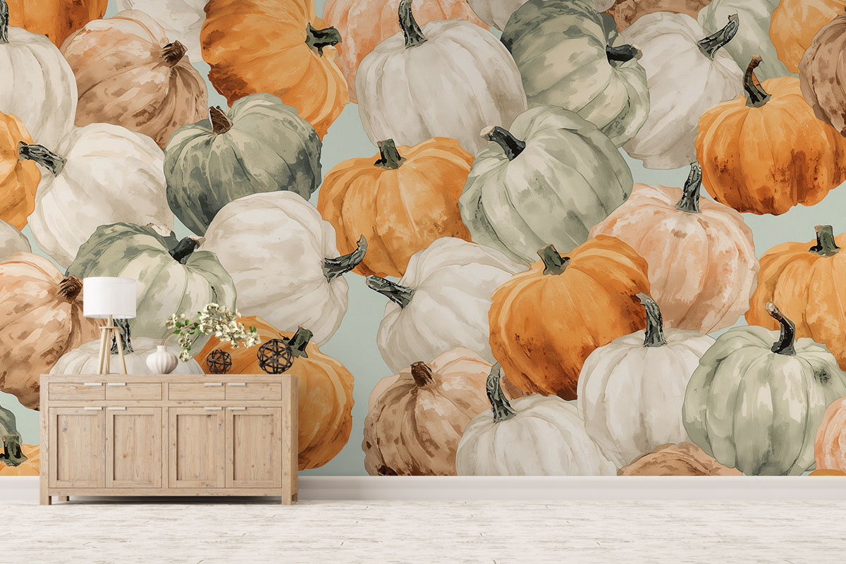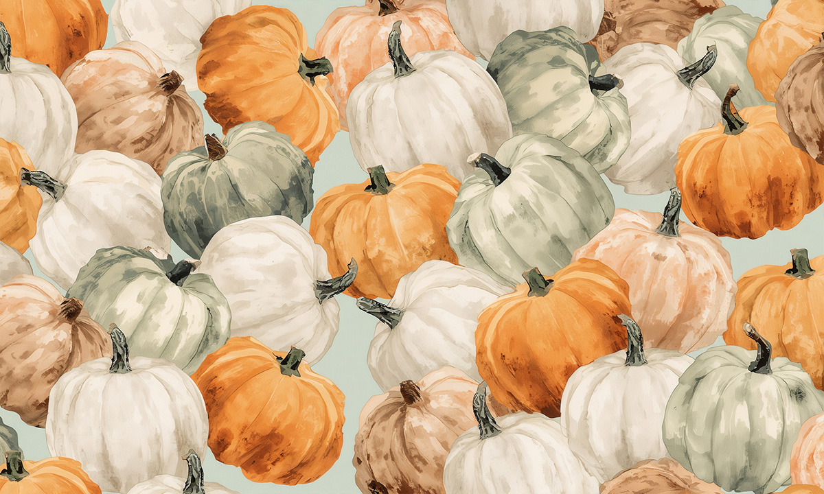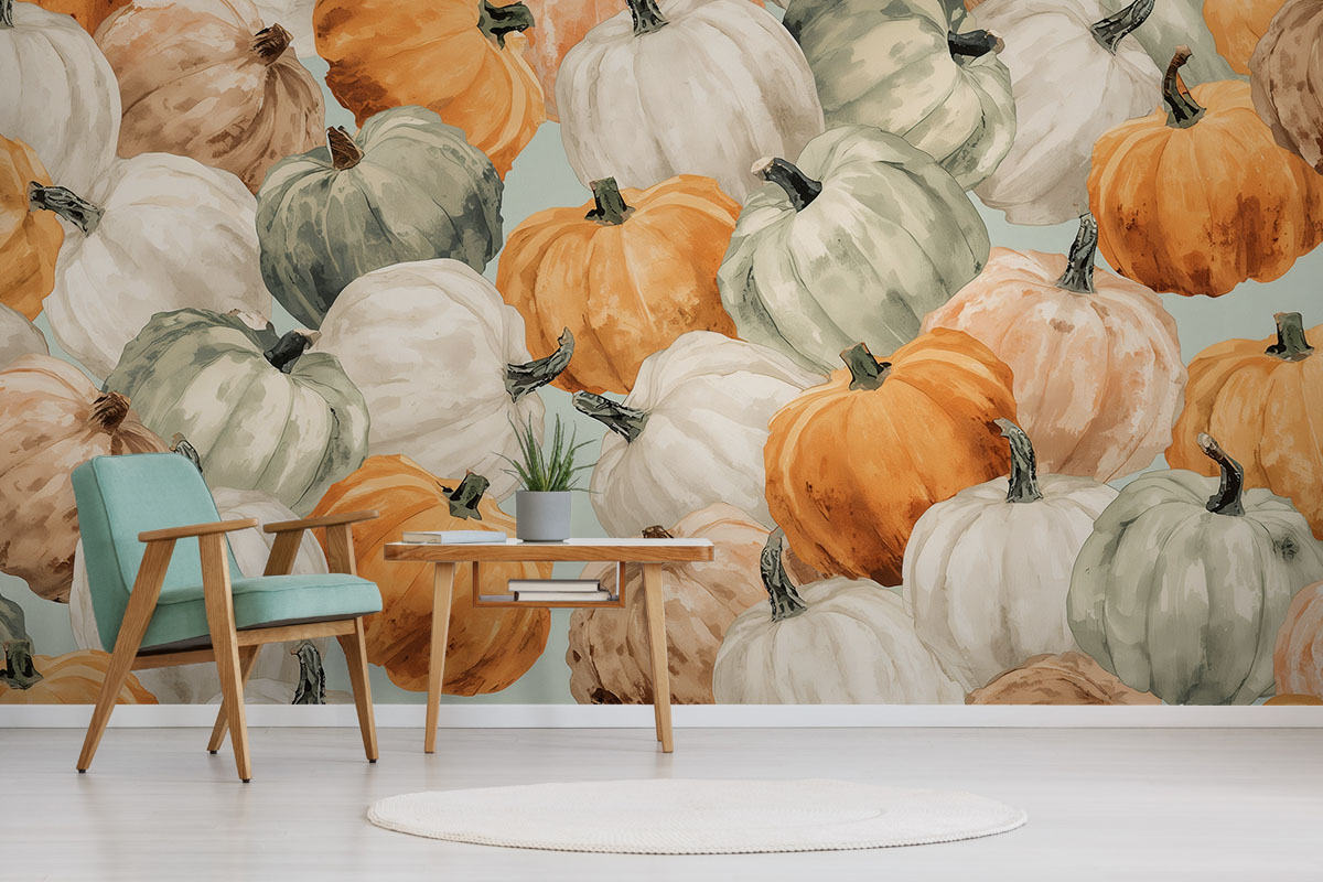 Aquarel pompoenen in oranje, wit en groen op lichtblauwe achtergrond. Zachte kleuren en rustieke charme.