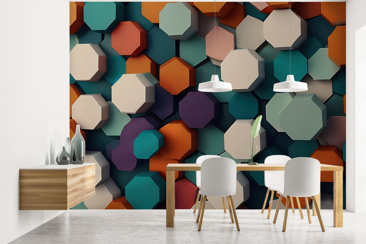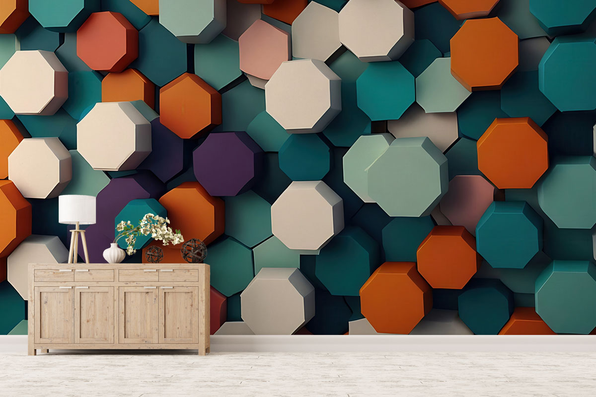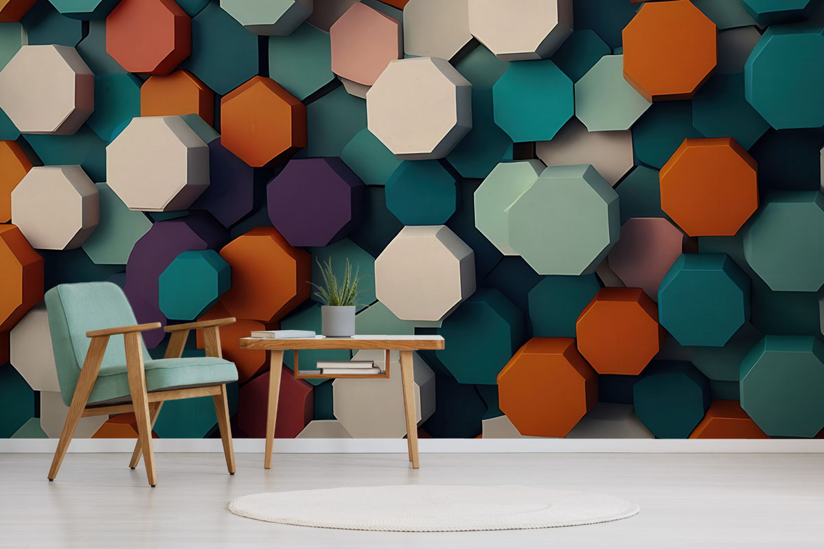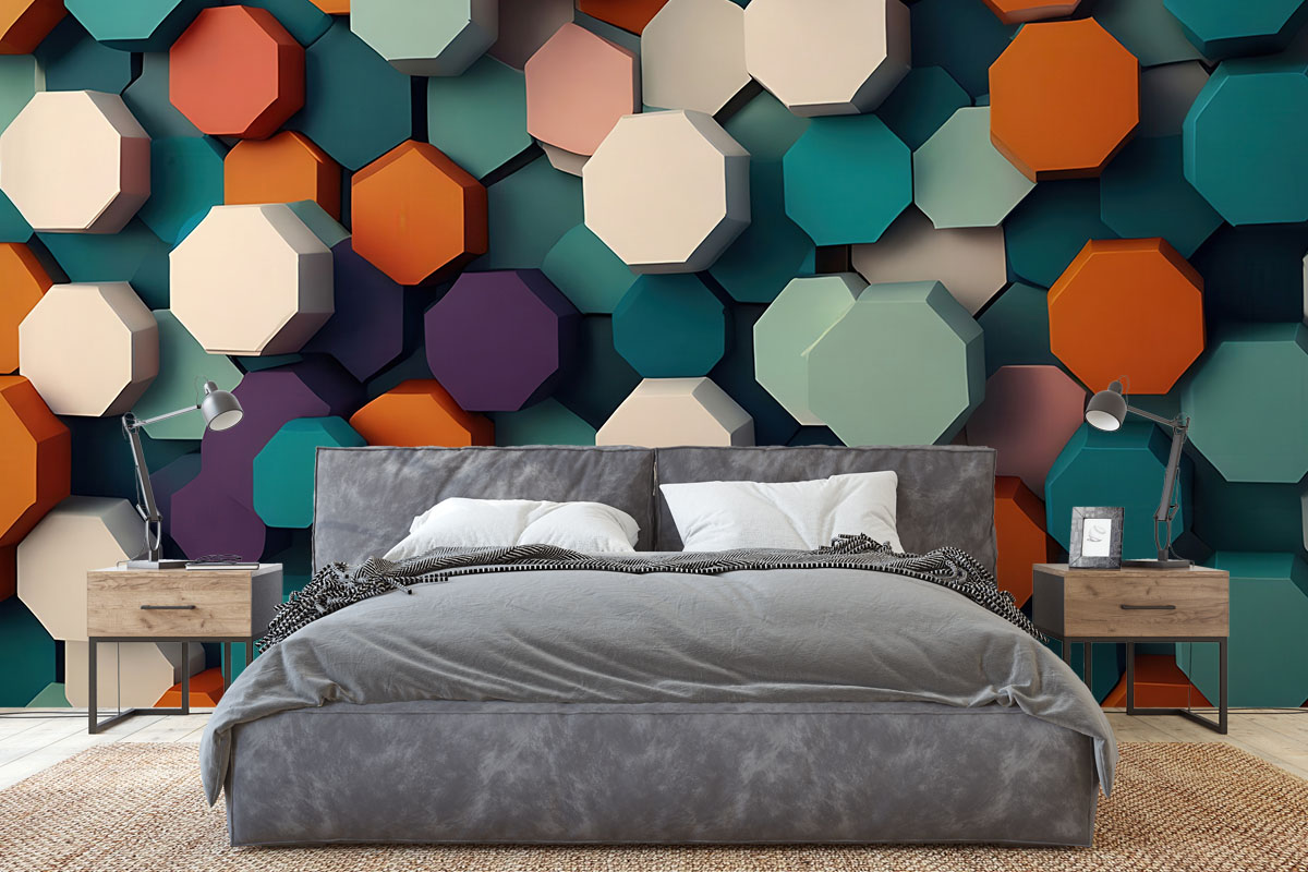 Hexagonaal patroon met turquoise, oranje en paars in 3D-effect. Modern en speels met optische diepte.