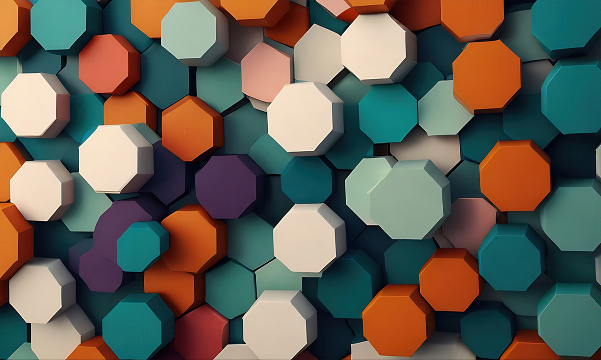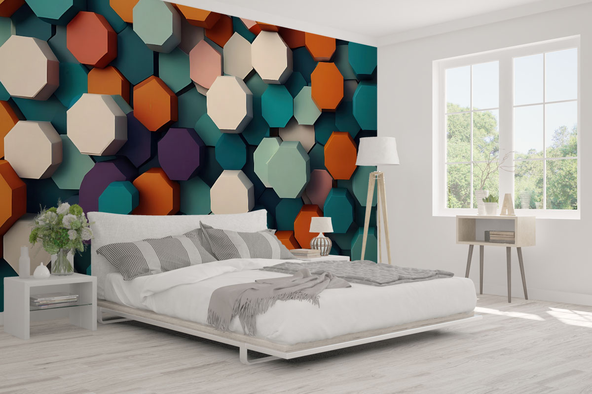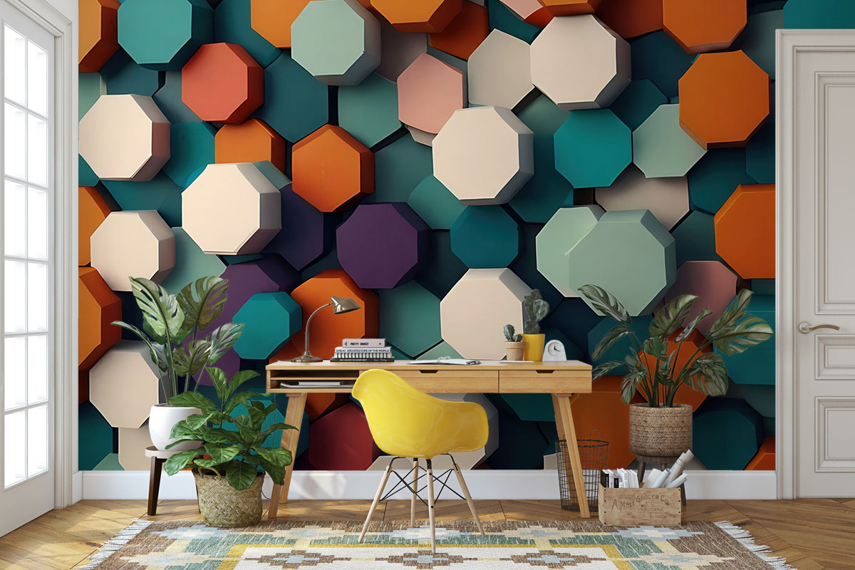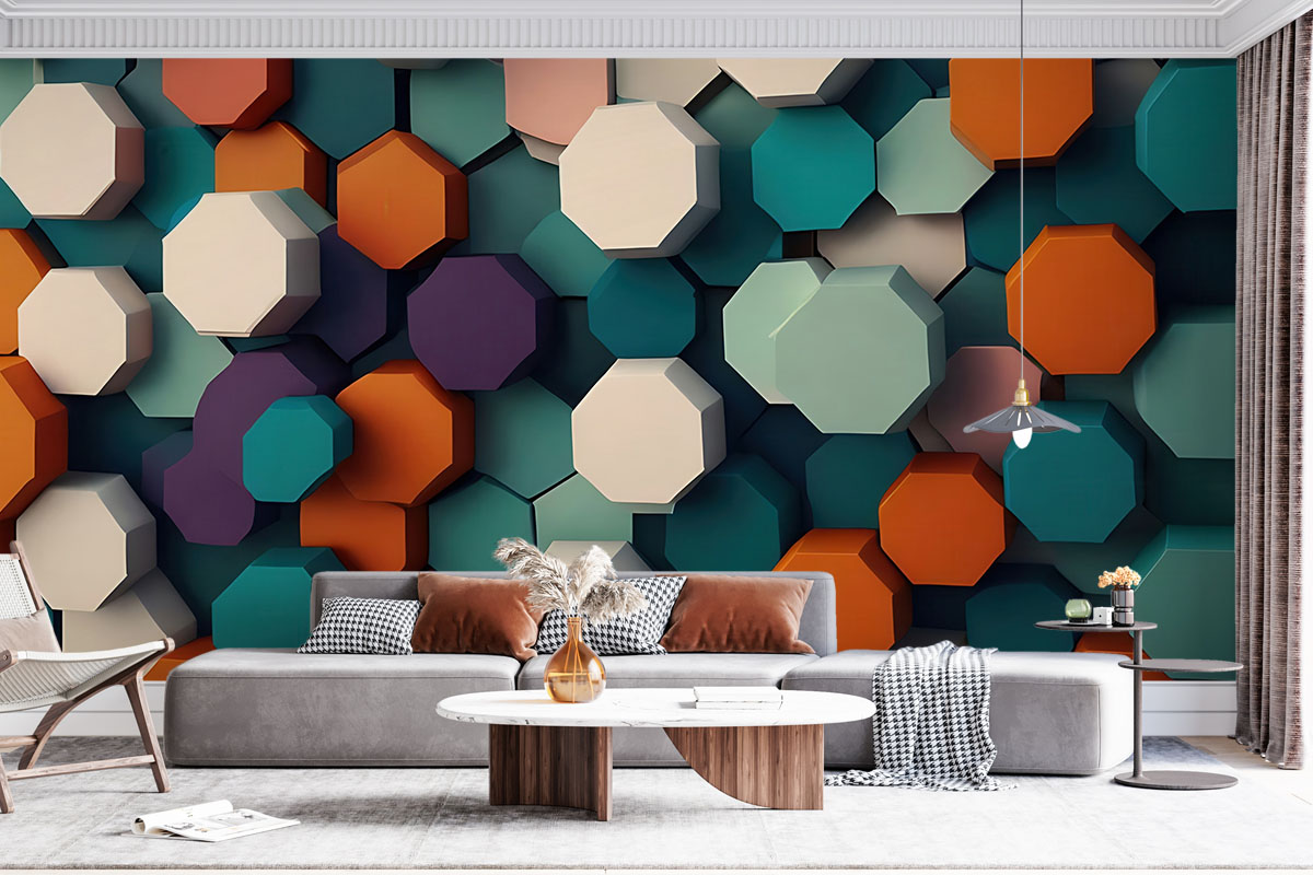 Hexagonaal patroon met turquoise, oranje en paars in 3D-effect. Modern en speels met optische diepte.