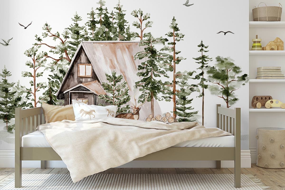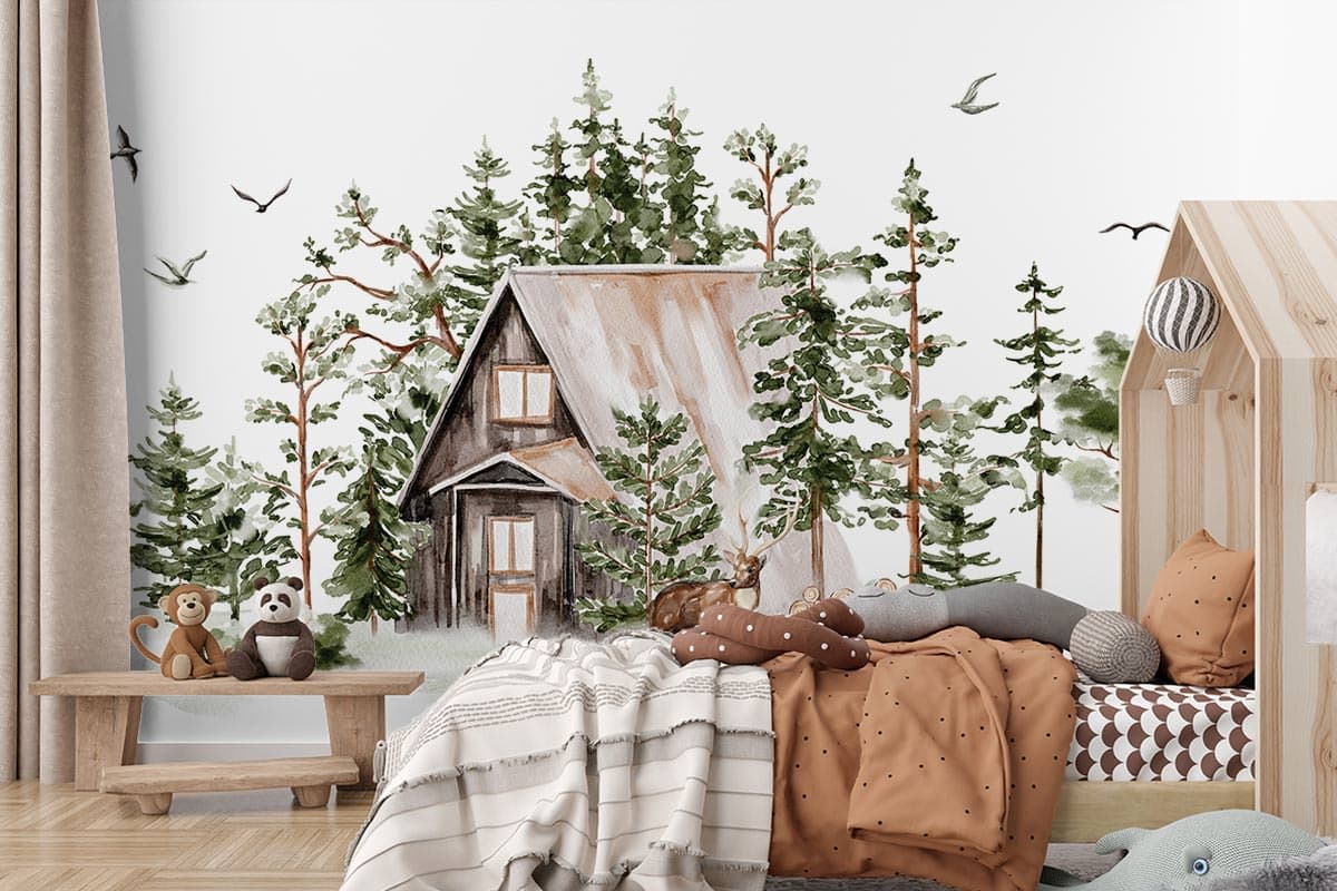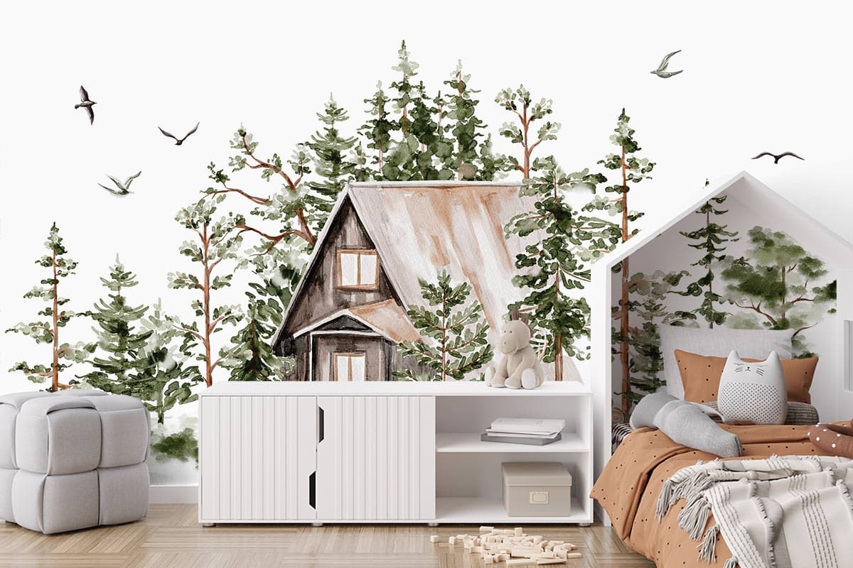 Wil je naast het behang ook een muur in de baby- of kinderkamer verven? Wij hebben alvast 3 Flexa Pure kleuren geselecteerd die perfect passen bij dit fotobehang Huisje in het bos.