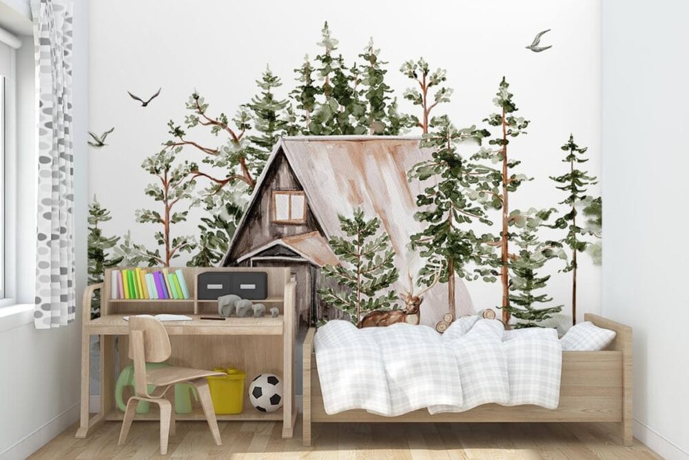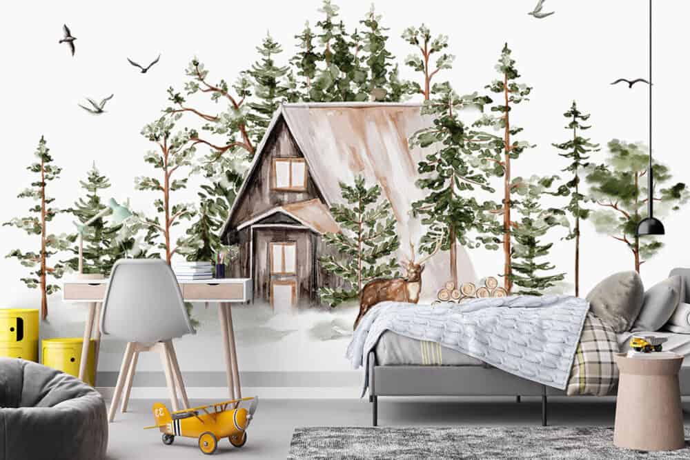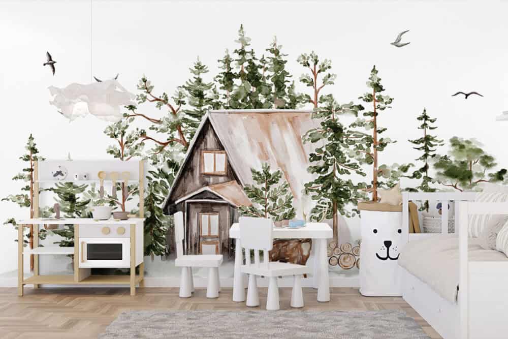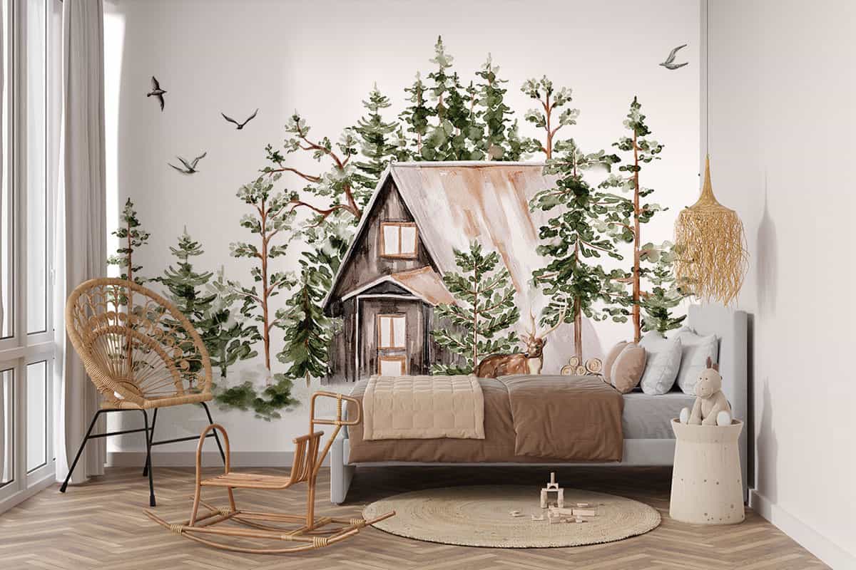 Wil je naast het behang ook een muur in de baby- of kinderkamer verven? Wij hebben alvast 3 Flexa Pure kleuren geselecteerd die perfect passen bij dit fotobehang Huisje in het bos.