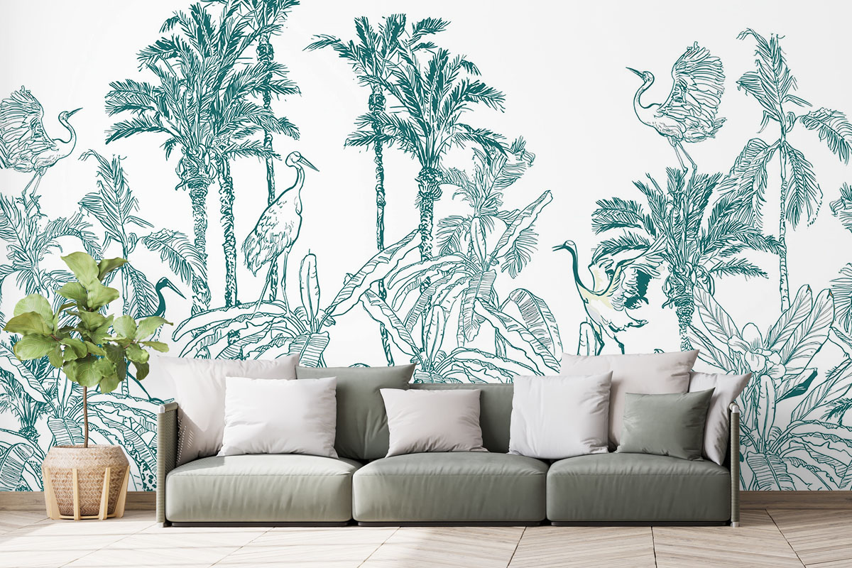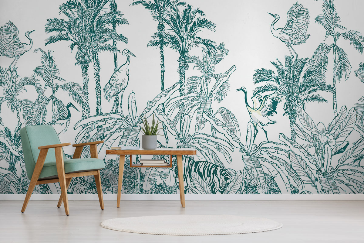 Wil je de muur combineren met verf? We hebben drie Flexa Pure kleuren geselecteerd die perfect matchen met dit fotobehang Jungle palmbomen. Zo creëer je eenvoudig een harmonieus interieur.