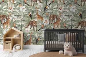 Wil je naast het behang ook een muur in de baby- of kinderkamer verven? Wij hebben alvast 3 Flexa Pure kleuren geselecteerd die perfect passen bij dit fotobehang Jungle patroon, lichtgroen.