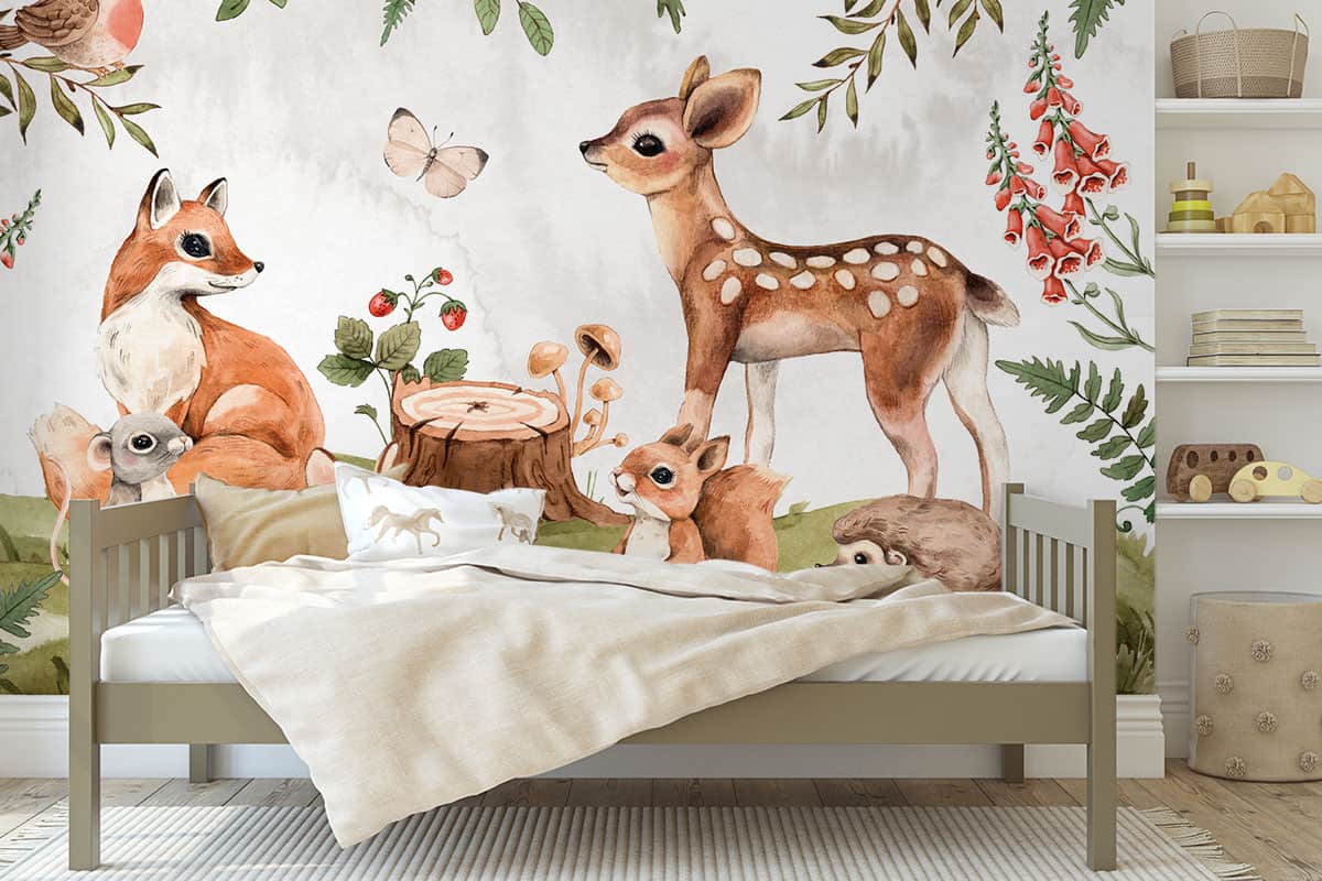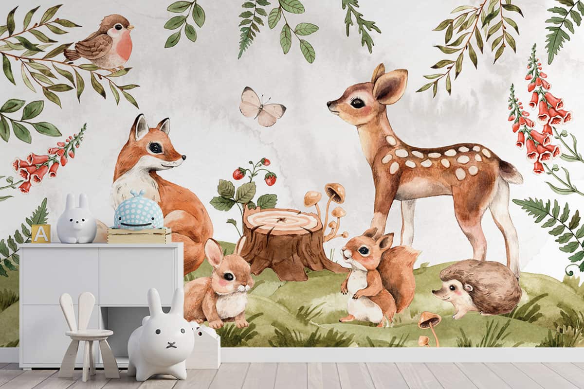 Wil je naast het behang ook een muur in de baby- of kinderkamer verven? Wij hebben alvast 3 Flexa Pure kleuren geselecteerd die perfect passen bij dit fotobehang Kleine vriendjes in het bos.