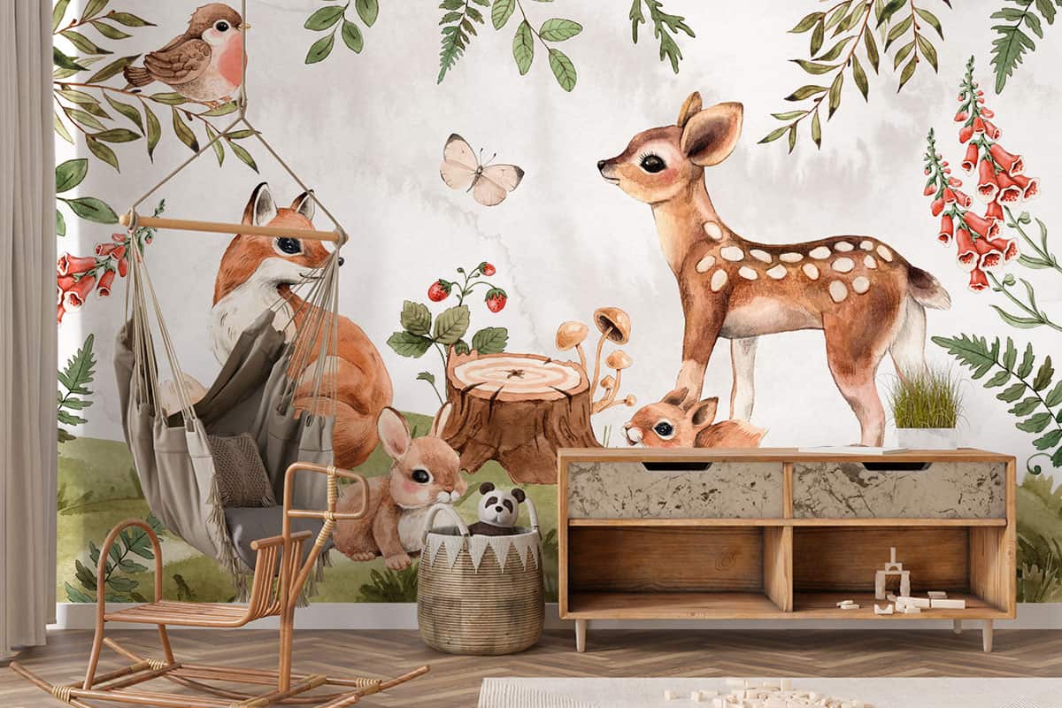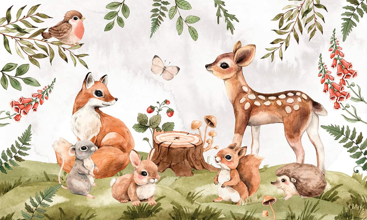 Wil je naast het behang ook een muur in de baby- of kinderkamer verven? Wij hebben alvast 3 Flexa Pure kleuren geselecteerd die perfect passen bij dit fotobehang Kleine vriendjes in het bos.