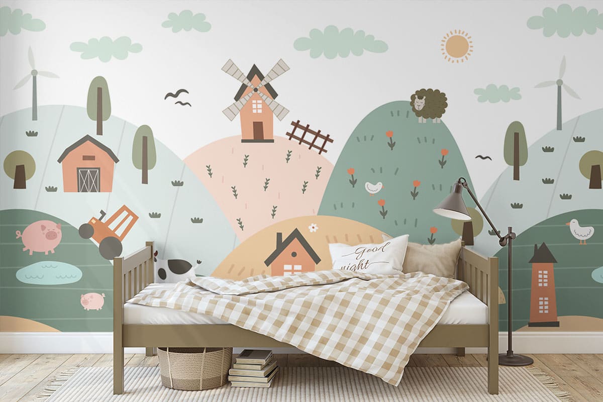 Jouw design Kleurrijk landschap wordt geprint op hoogwaardig duurzaam vliesbehang van premium kwaliteit. Dit stevige behang (200 g/m²) is krasvast, robuust en blijft jarenlang mooi — perfect voor in de kinderkamer, babykamer of speelkamer. Je kunt het behang helemaal op maat laten maken, zodat het ontwerp precies past op jouw muur. Dankzij de gladde afwerking en strakke structuur komt elk detail van het ontwerp perfect tot zijn recht.