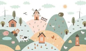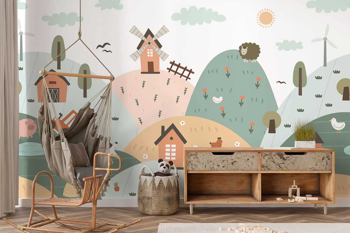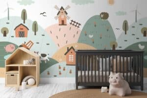 Wil je naast het behang ook een muur in de baby- of kinderkamer verven? Wij hebben alvast 3 Flexa Pure kleuren geselecteerd die perfect passen bij dit fotobehang Kleurrijk landschap.