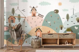 Jouw design Kleurrijk landschap wordt geprint op hoogwaardig duurzaam vliesbehang van premium kwaliteit. Dit stevige behang (200 g/m²) is krasvast, robuust en blijft jarenlang mooi — perfect voor in de kinderkamer, babykamer of speelkamer. Je kunt het behang helemaal op maat laten maken, zodat het ontwerp precies past op jouw muur. Dankzij de gladde afwerking en strakke structuur komt elk detail van het ontwerp perfect tot zijn recht.