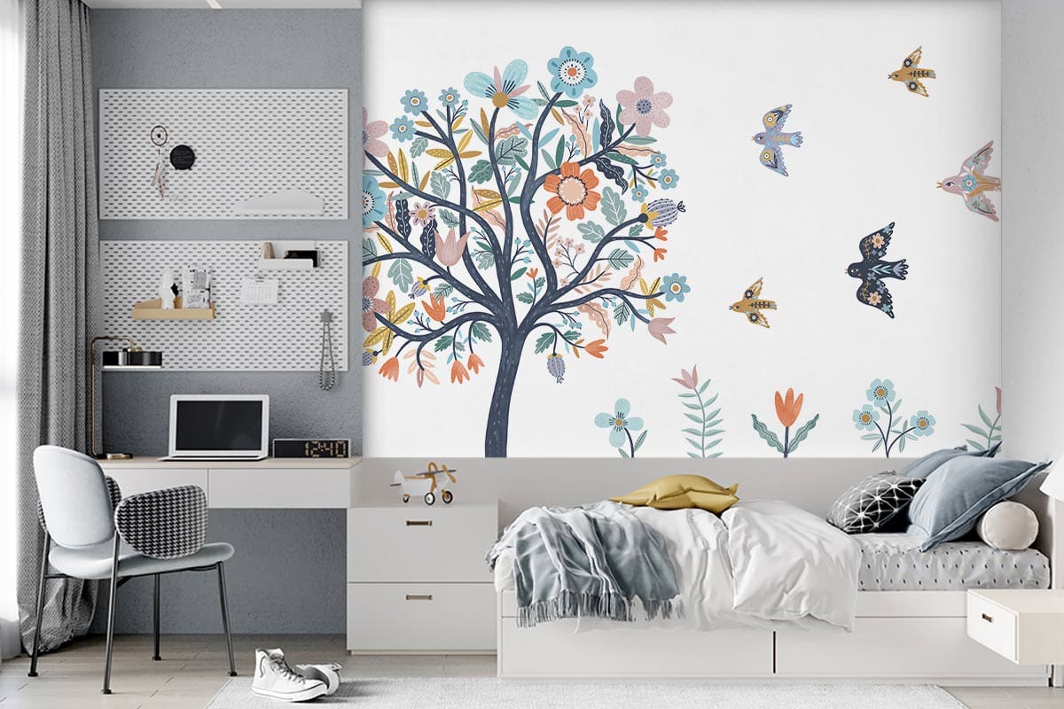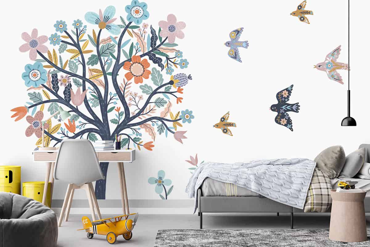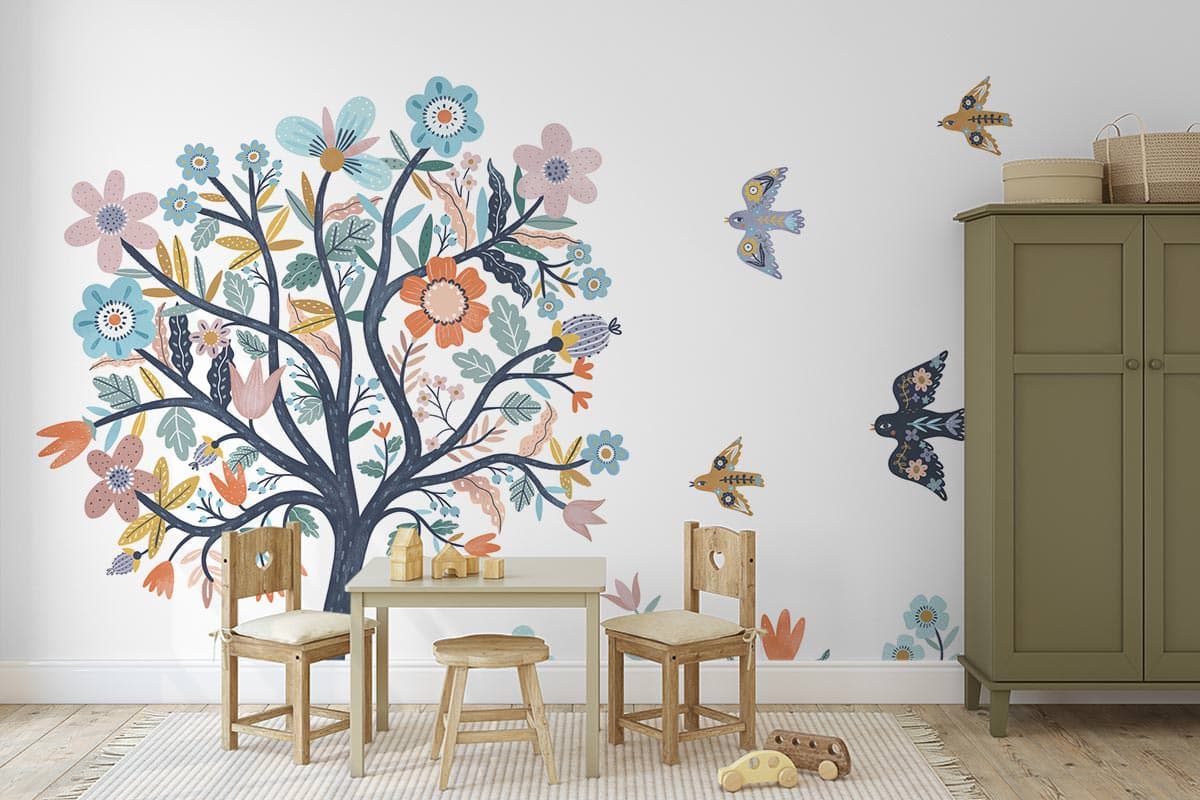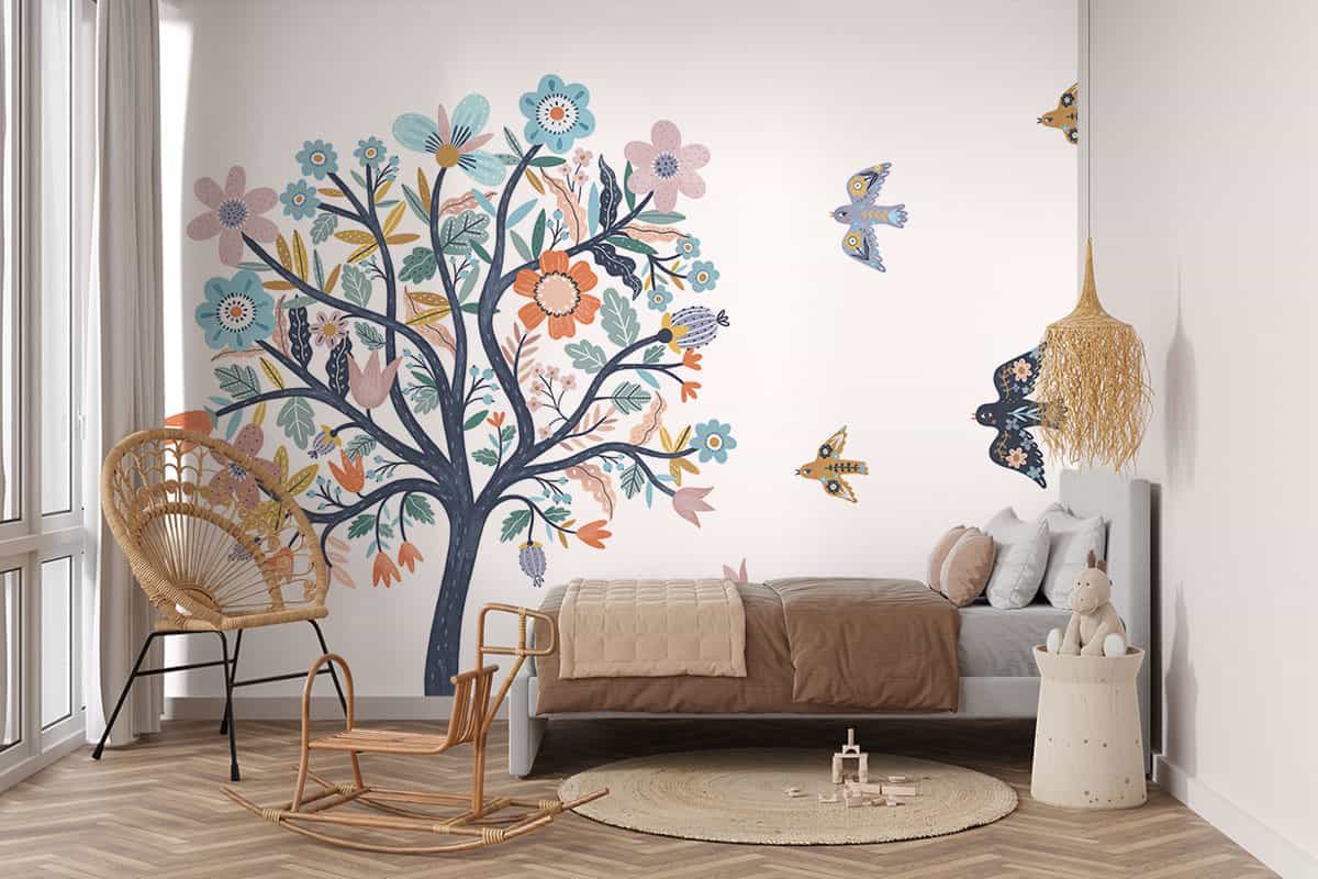 Wil je naast het behang ook een muur in de baby- of kinderkamer verven? Wij hebben alvast 3 Flexa Pure kleuren geselecteerd die perfect passen bij dit fotobehang Kleurrijke boom.