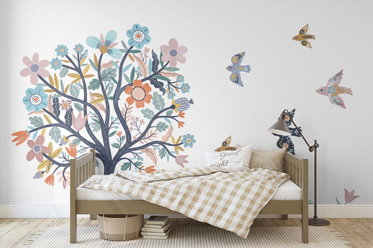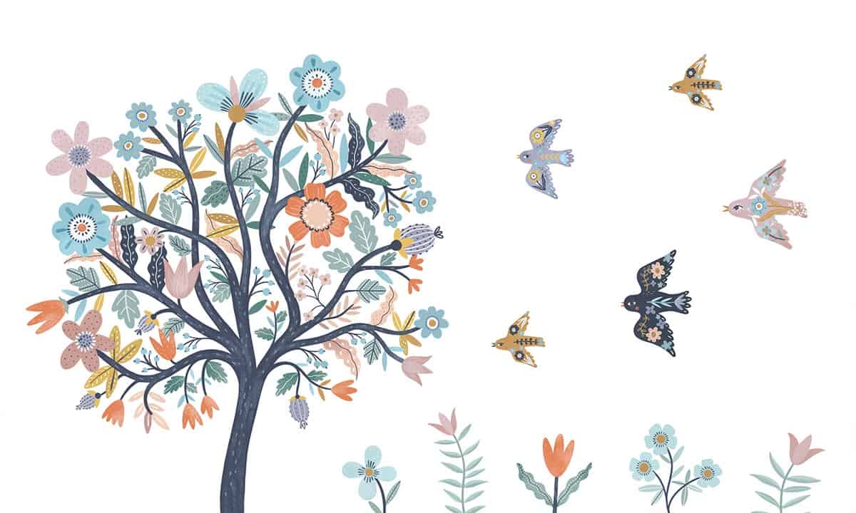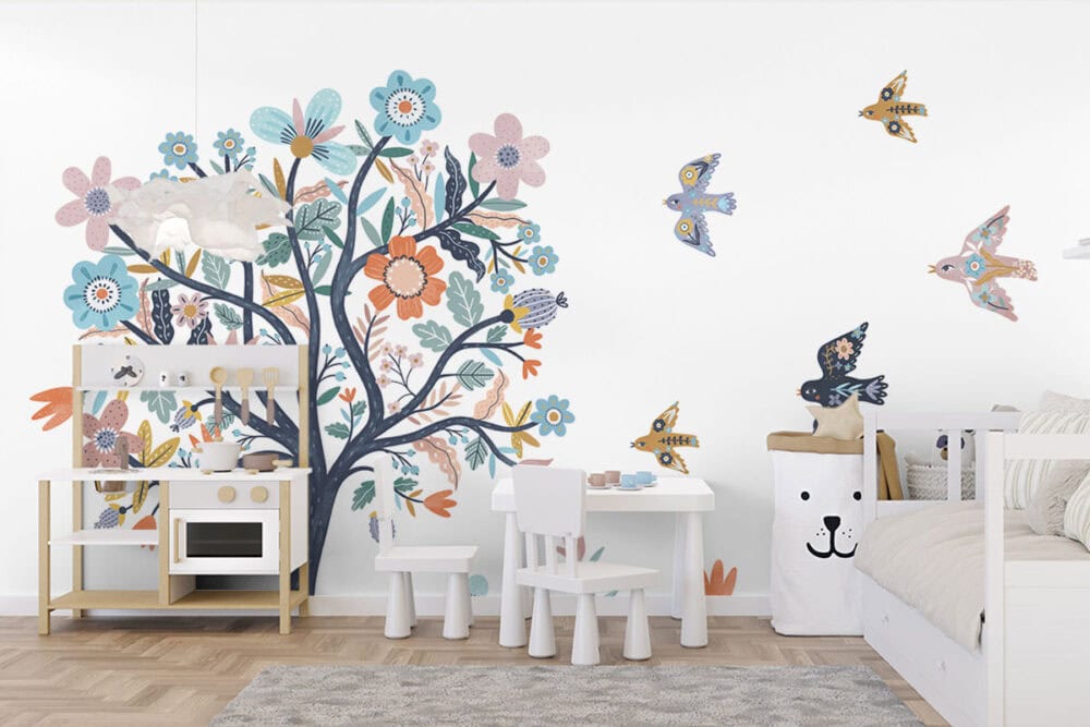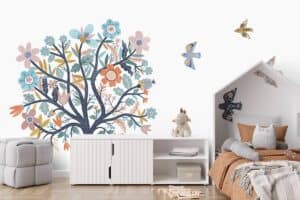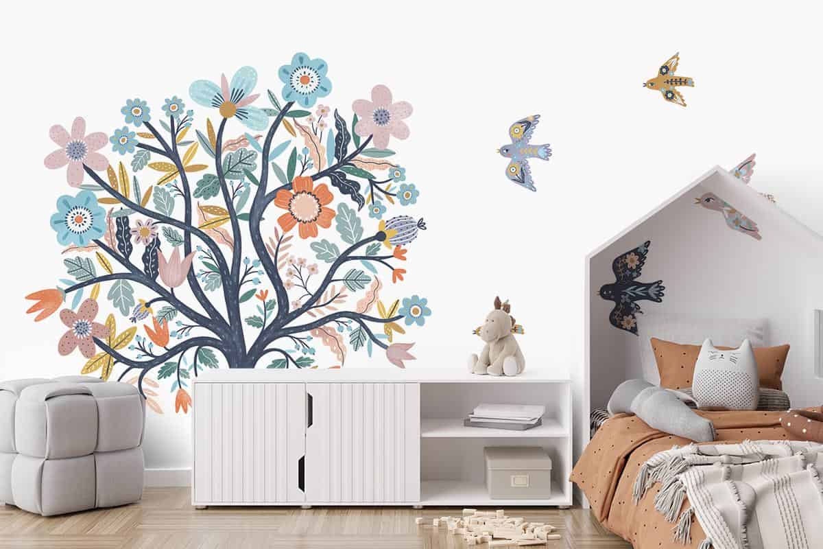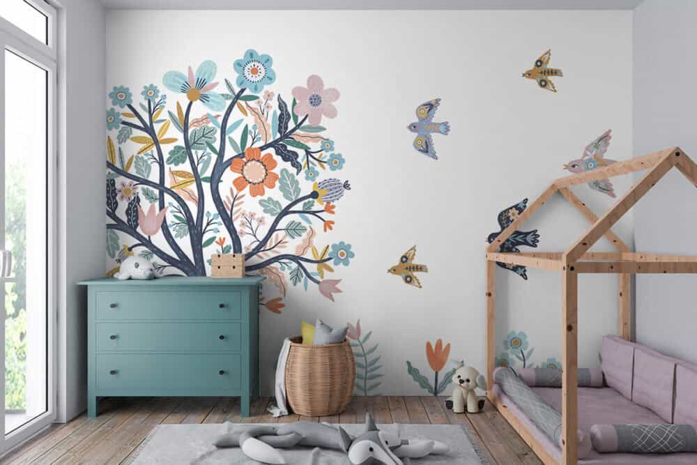 Wil je naast het behang ook een muur in de baby- of kinderkamer verven? Wij hebben alvast 3 Flexa Pure kleuren geselecteerd die perfect passen bij dit fotobehang Kleurrijke boom.