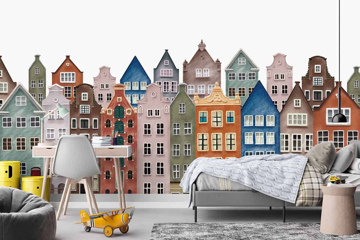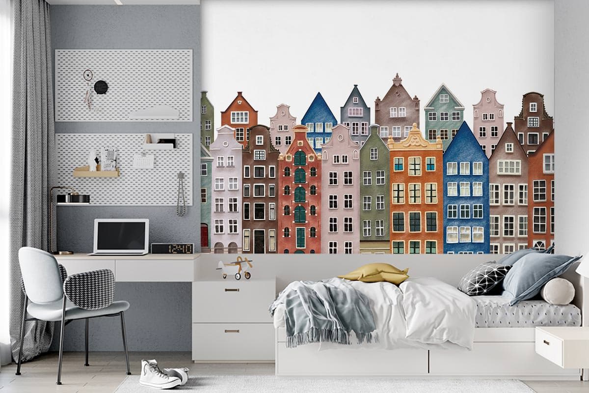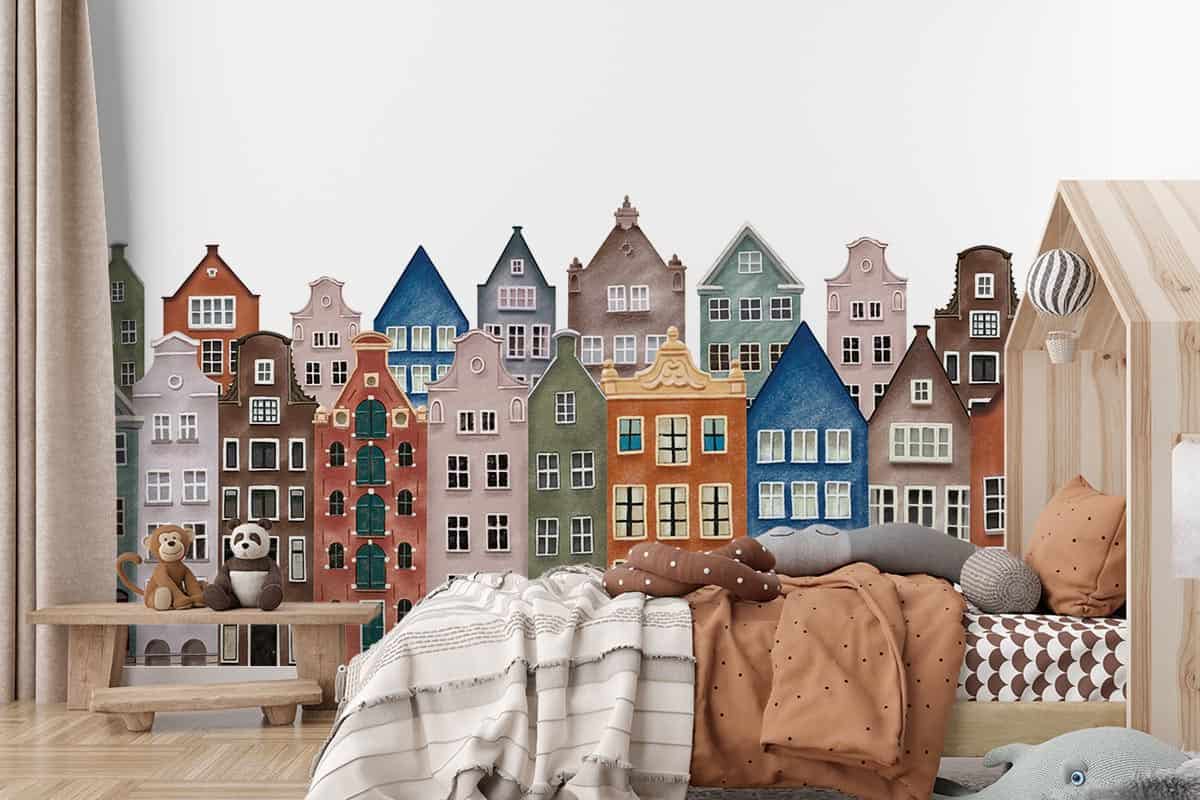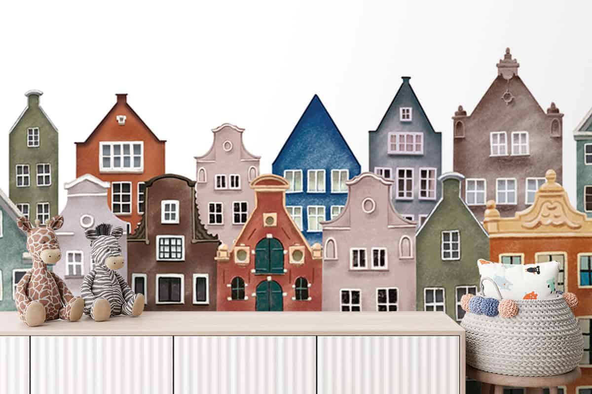 Met deze kleurrijke herenhuisjes op een rij waan je je zo in Amsterdam, Utrecht of Den Haag! Een lekker behangetje voor de stadse kinderkamer.