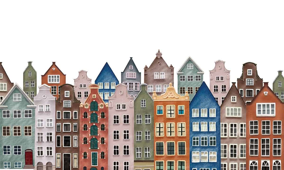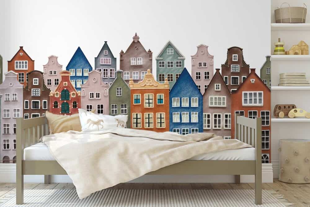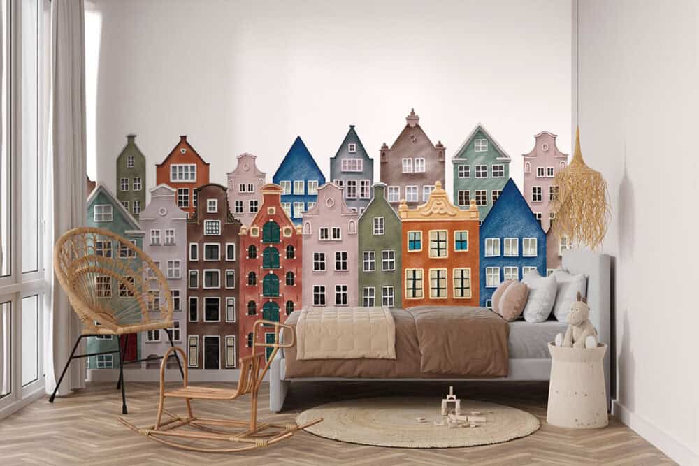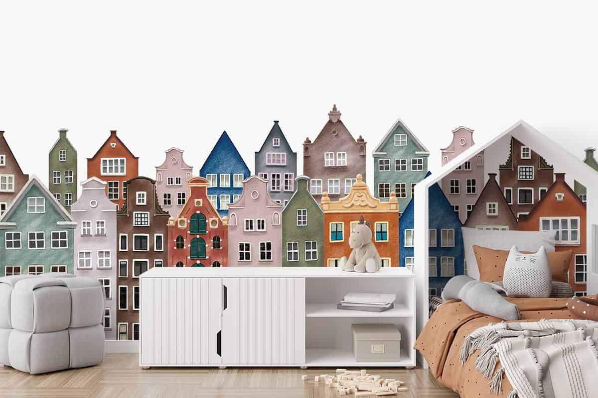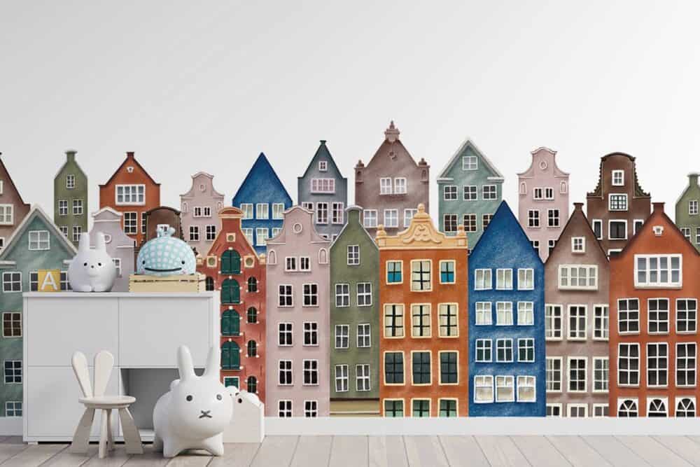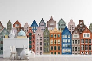 Met deze kleurrijke herenhuisjes op een rij waan je je zo in Amsterdam, Utrecht of Den Haag! Een lekker behangetje voor de stadse kinderkamer.
