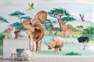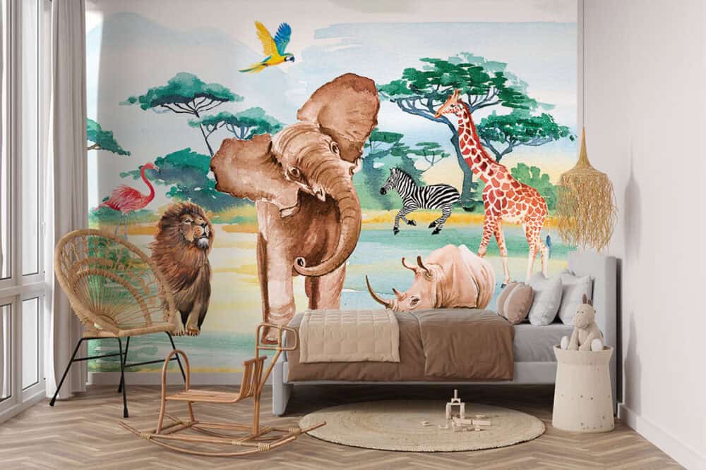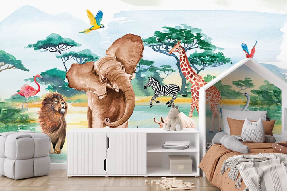 Jouw design Kleurrijke savanne wordt geprint op hoogwaardig duurzaam vliesbehang van premium kwaliteit. Dit stevige behang (200 g/m²) is krasvast, robuust en blijft jarenlang mooi — perfect voor in de kinderkamer, babykamer of speelkamer. Je kunt het behang helemaal op maat laten maken, zodat het ontwerp precies past op jouw muur. Dankzij de gladde afwerking en strakke structuur komt elk detail van het ontwerp perfect tot zijn recht.