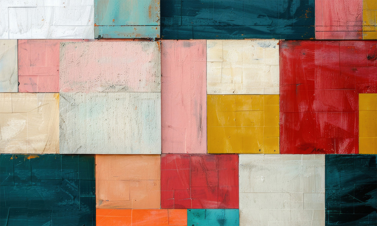 Een moderne compositie van kleur en vorm geïnspireerd op Mondriaan brengt ritme en rust.